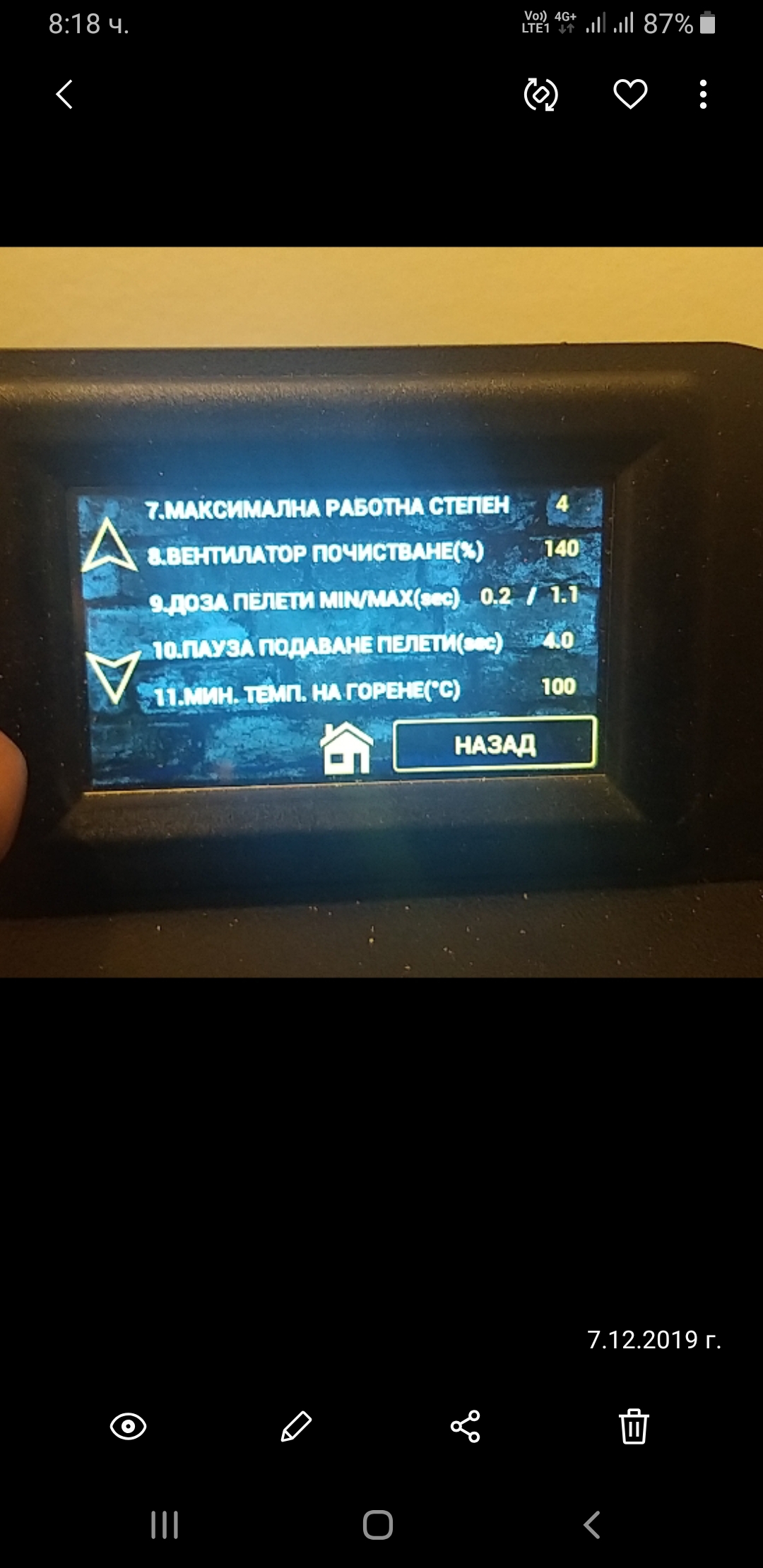 Здрасти моите настройки са доза мин/макс 0.4/1.6 Пауза подаване 4.2 Вентилатори 1ва 950 .2ра 1100.3та 1200. 4та 1250. 5та 1330. Пробвах да намаля вентилаторите, но започна да пуши камината и ги върнах на 1050/1100/1150/1200/1250 5та степен я махни! До четвърта! Много бързо стопля но повечето замина...