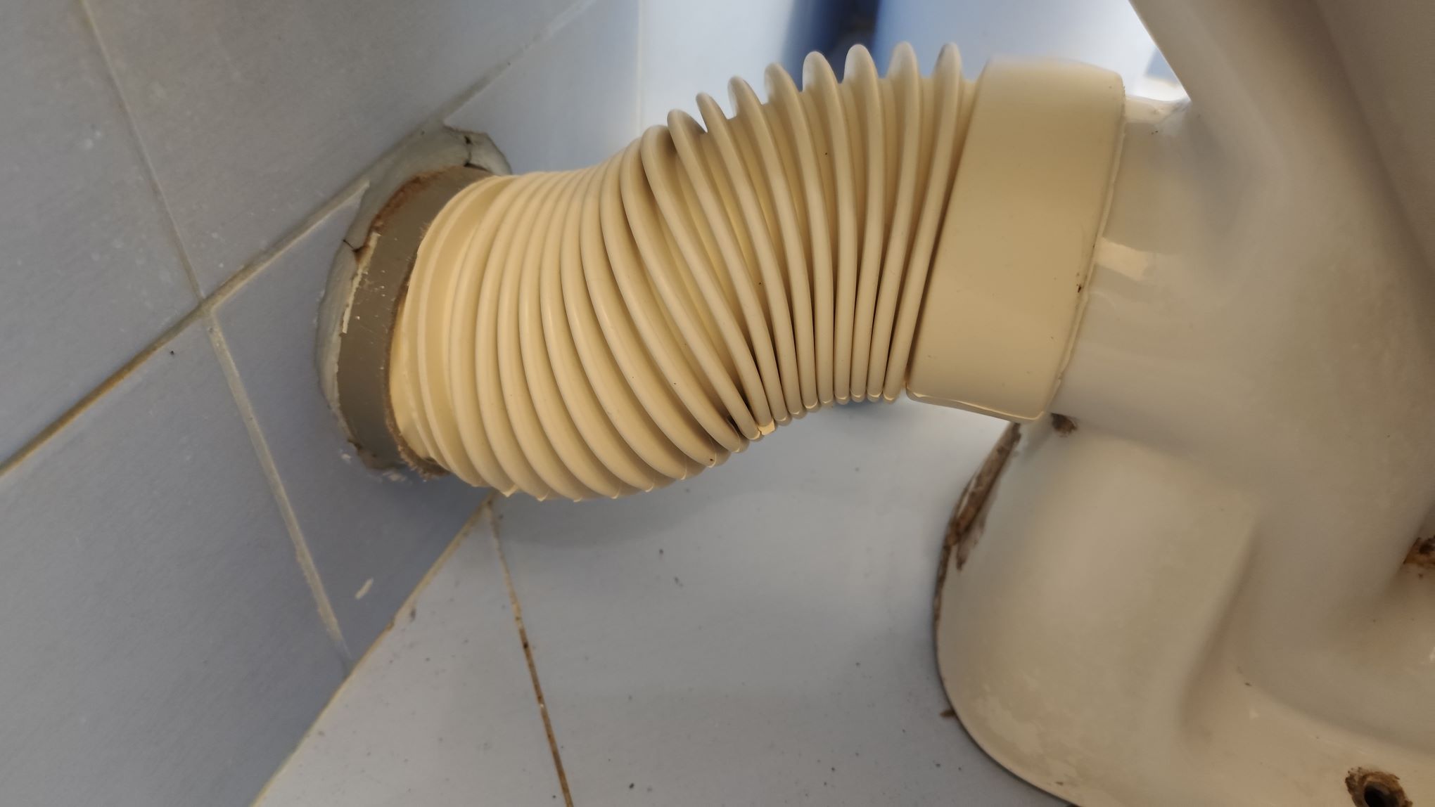 С гумения маншон тоалетната не можеше да се приближи повече към стената. Има и по-къс такъв маншон, но той не може да се извие колкото трябва за да компенсира разликата между двата отвора във височина и настрани. С двата твърди ексцентрика дойде добре.