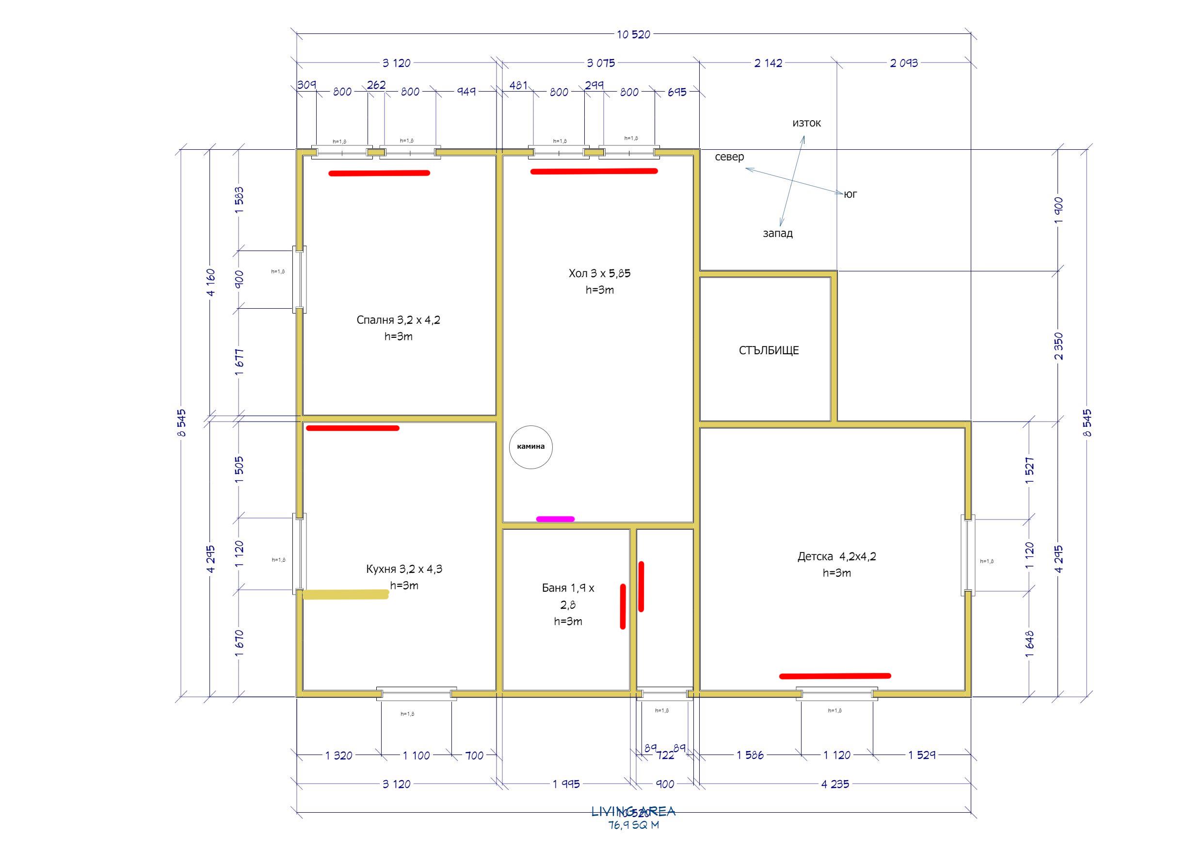 При кухнята в края на северния прозорец ,ще има плот(нарисуван в жълто) сметнах ,че там радиатор няма да стой добре и ще трябва да е на вътрешната .Тя e ‾|_ образна (вдлъбната и изпъкнала части) ,мястото в червено е дълго 1,80
