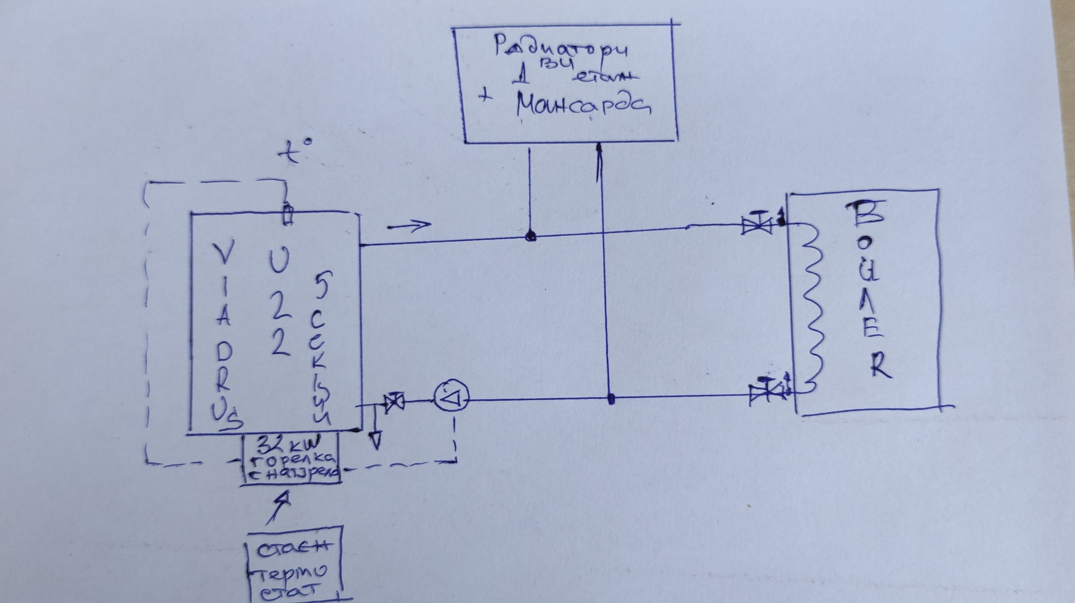 Здравейте, бил искал да се извиня за темата но ми предстой да си монтирам 200 литров бойлер на Елдом инвест с две серпентини и електронно управление. На прикачената схема е показана настоящия вид на системата със старият бойлер. Системата е с една циркулацонна помпа. Бих искал съвет как да преправя схемата така че управлението на горелката /което е на натурела/ да управлява втора помпа за бойлера и да подгрява водата в него, дори когато отоплението на къщата е в StandBy?