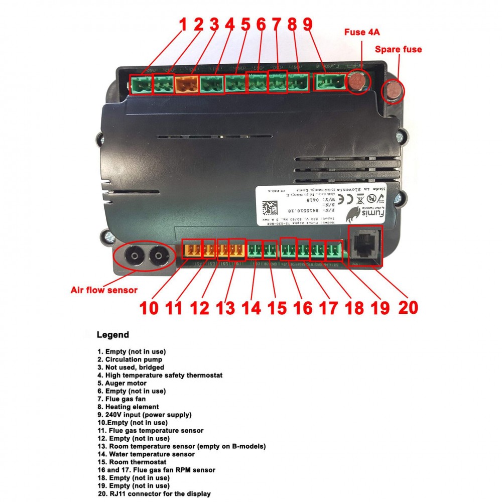 За въпросната камина Аурига 25 клемите на термостата са номер 15. Ако е платката от картинката.