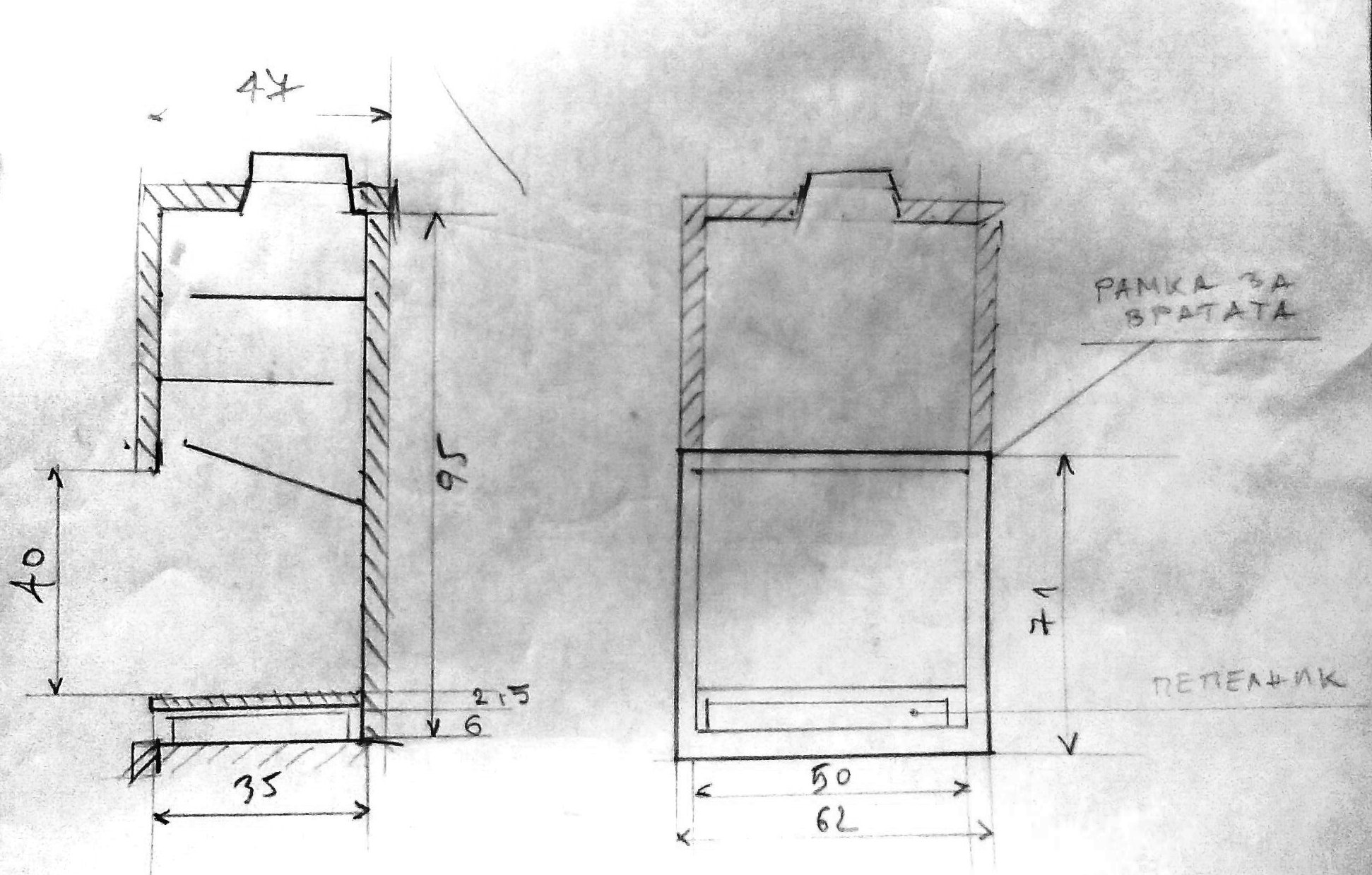 Ш 50, В 95, Д 35 - това са вътрешни размери. Съотвено към тях се добавят по 6 см. дебелина на огн. тухли.