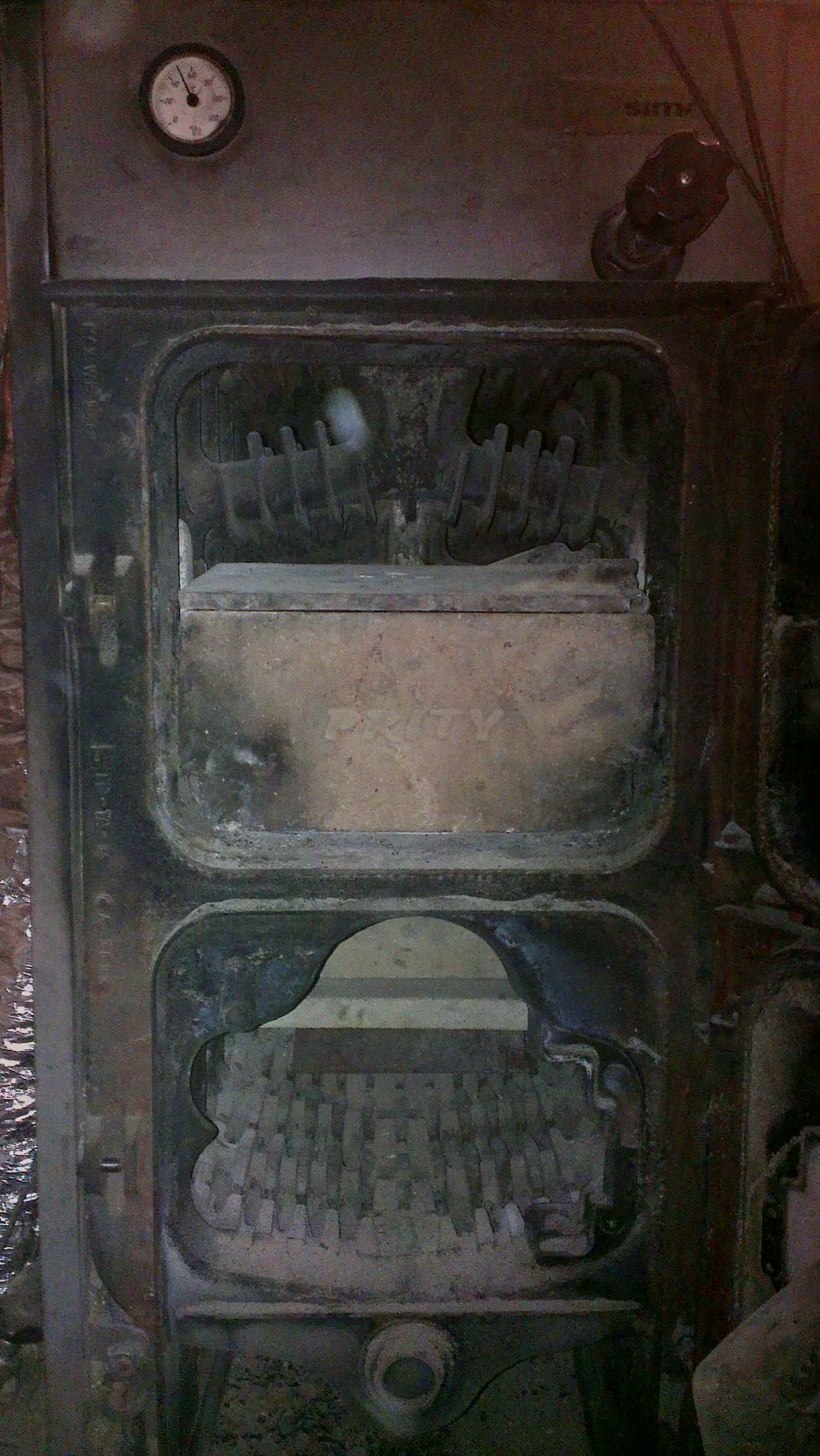 Така над и пред горелката на около 10-12 см. има огнеупорни тухли, а отстрани глидери. Пламъкът облизва стените, слиза надолу през решетката и двата отвора отстрани на П-то и тръгва нагоре покрай задната стена по S-образния си път. Така всъщност добавям още един ход. И накрая за още заиграване има още една плоча горе. Пред нея също сложих тухличка, че много се нагряваше горната врата: Получи се интересен ефект. Паднаха градусите, намалих малко времената за зареждане и мисля че държи жарава в суспенд по-дълго.