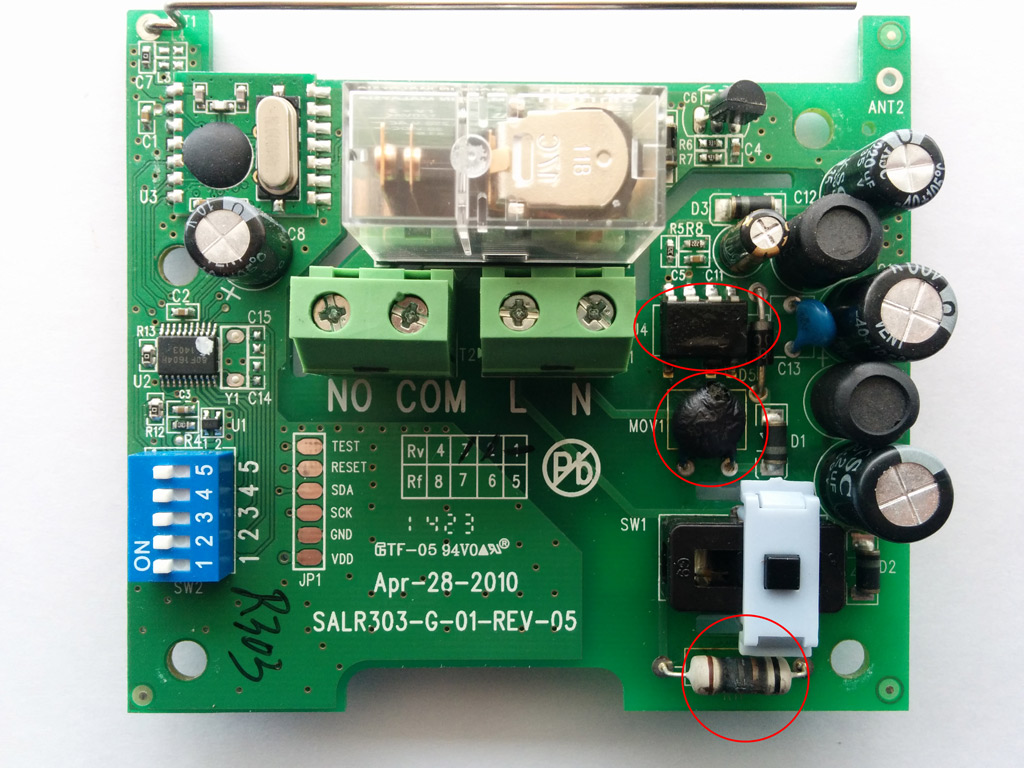 Здравейте. Случи се един инцидент с приемника на термостата, който ми управлява пелетната горелка. Поради електрически проблем, към приемника са подадени две фази, вместо фаза и нула. В резултат на това има някой изгорели компоненти на платката и тя разбира се не работи. Тъй като са обгорели (опушили) е невъзможно да се видят точните им цветове и номера.