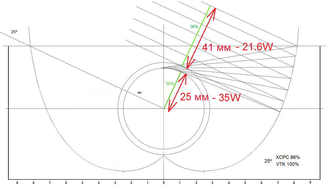 Абсорбиращата площ на рефлектора е 4.1х175 = 715.5 кв. см. Тази площ е приела 71.6W, след пречупване и абсорбиране от тръбата, получената допълнително от рефлектора енергия е 21.6W, което е 30% от първоначално приетата. Процентът е малък, поради острия ъгъл - на предишната страница е описано.