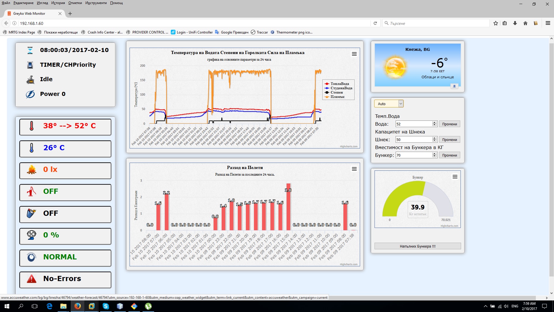 stan4o333 написа:Сега ще опитам да обясня на българскиСупер. За сега ще сложа програмата на няколко приятели , които също имат такава горелка за да се тества за грешки. Инсталацията става по следния начин , те си взимат въпросното мини компютърче https://www.raspberrypi.org/products/ra ... 3-model-b/ дават ми го и аз им го инсталирам слагам му програмата , единственото което трябва да направят те е да свържат кабела на въпросното устройство с горелката след което ми дават достъп до техния домашен рутер през Team Viewer за да пренасоча портовете към въпросното устройство за да се вижда отвсякъде през интернет. От там нататък през телефон или през компютър, кой както иска , се прави връзка с въпросното устройство и си наблюдава " управлява горелката ".