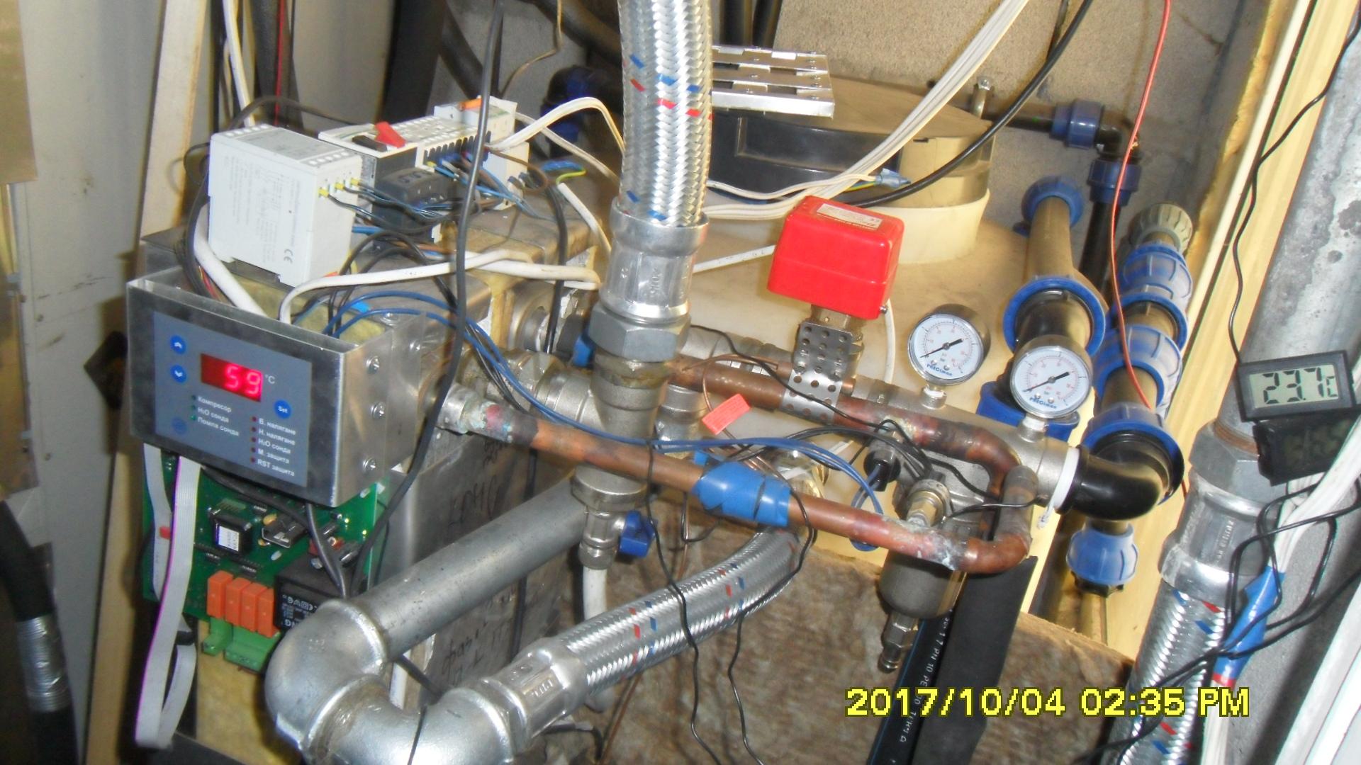 На първа снимка сондажната вода от потопяемата помпа идва по черната тръба ф40, минава през неръждаем самопочистващ се филтър ) с двата манометъра отгоре) и влиза в пластинчатият топлообменник на ТП. Между топлообменника и филтъра е Т образното отклонение 1 1/2 за пълнене на буф. съд от 500 литра. Това е поцинкованата тръба 1 1/2 към нас и обратно мека антивибрираща връзка 1 1/2