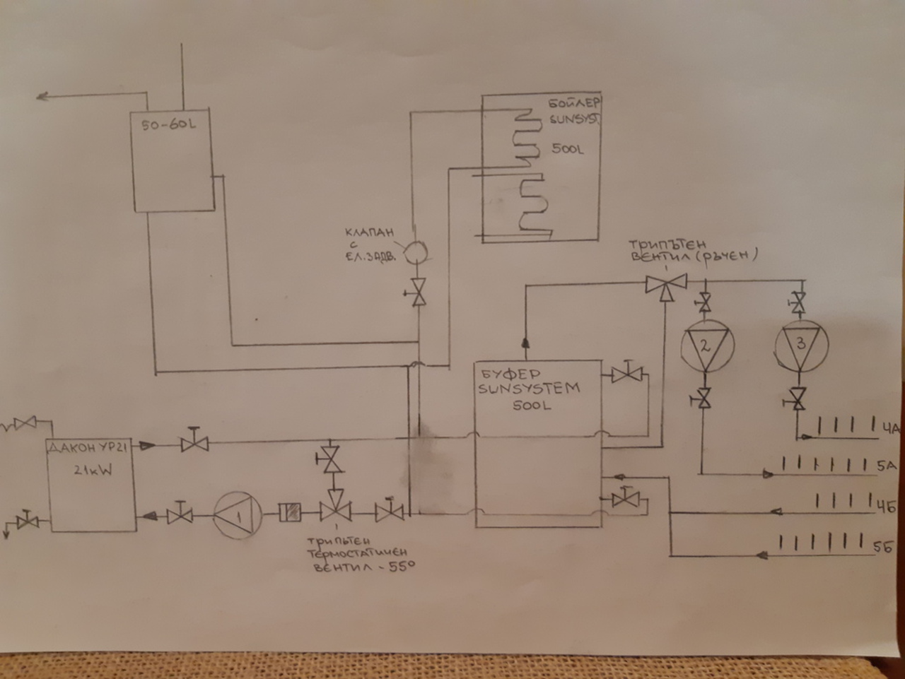 Мога да кача и реални снимки ако проявите интерес.Сигурен съм че не всичко е наред.Целта ми е за следващия отоплителен сезон с помощта на вашите съвети да изчистя грешките.Също така намеренията ми са да включа и газов котел към системата.Първият ми въпрос е за помпите.Какви трябва да бъдат.В момента помпа 1(котелната) е 25/4 работеща на 1 или 2 степен.Помпа 2 захранваща колектор 5а е 25/5 електронна(Mayer).Към колектор 5а са свързани 6 радиатора.Помпа 3 към колектор 4а захранва 4 преработени климатични тела.Тя е 25/6.На радиаторите ,без този в банята има термо глави.Има и два безжични стайни термостата съответно управляващи помпи 2 и 3.Котелната помпа се включва от термостат в момента нагласен на 50гр.Ако трябват още детайли ще дам.Очаквам вашите мнения.