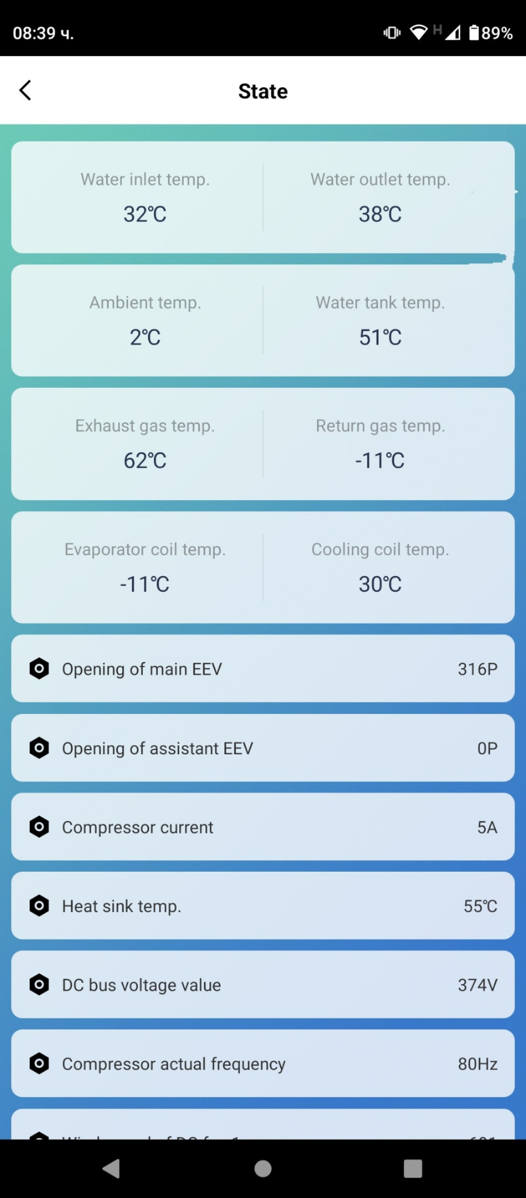 Също и термопомпата дали е на БГВ или на отопление компресора показва една и съща мощност - 74 до 80Hz. Защото в параметрите е ограничен до 80Hz.