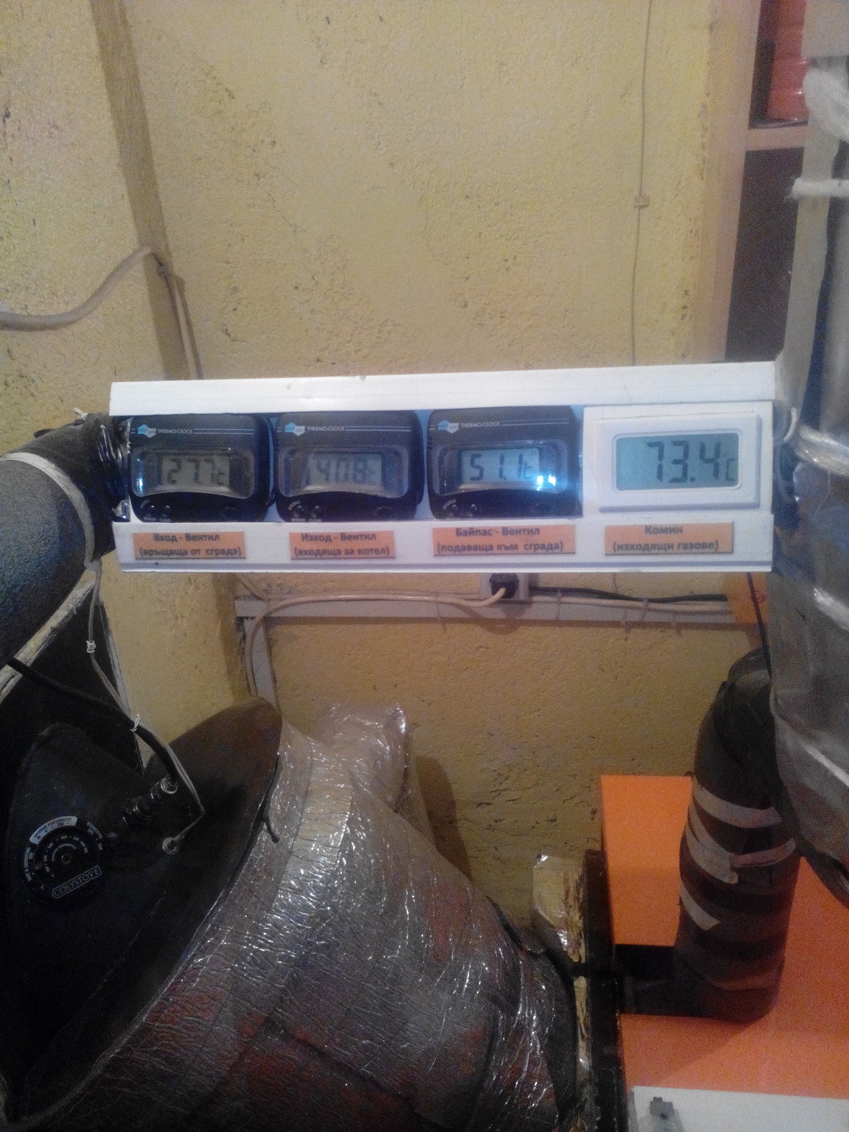 Който с следил мненията ми знае че съм с топлообменник , ламбда наблюдение за настройките и още доста подобрения, температура на изходящите газове между 65 - 75 градуса.. Чак конденза от пушека ни замръзва на комина..