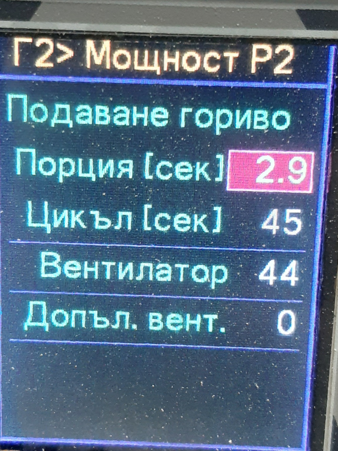2. Горното не ми е толкова важно, но следното ми е интересно: Всеки се интересува от настройките. Те обаче са строго индивидуални от много фактори - колко радиатори, какъв обем, какво гориво и т.н. Обаче има една настройка, която е обща за всички (говоря за горелка и котел грейко 20рб и слънчогледови пелети) - това е запалването и разгарянето и евентуално модулацията до момента когато се включи помпата. Настройките са в секунди, които са различни за всички спрямо капацитета на шнека, но секундите като се обърнат в количество пелети(кг) става едно и също за всички. Да кажем, че помпата се включва на 60гр, до този момент няма циркулация на вода, т.е. има някакви оптимални и универсални настройки за достигане на температура 60гр със слънчогледови пелети. Някой да сподели опит дали е променял стандартните настройки за запалване и разгаряне за намаляване на разхода до достигане на 60гр? Защото на мен ми се струва, че моята много лапа от 20 до 60 4кг отиват, после като влезе в режим е добре, по 1кг на час. И се оказва, че почти половината от разхода за деня отива само за палене.