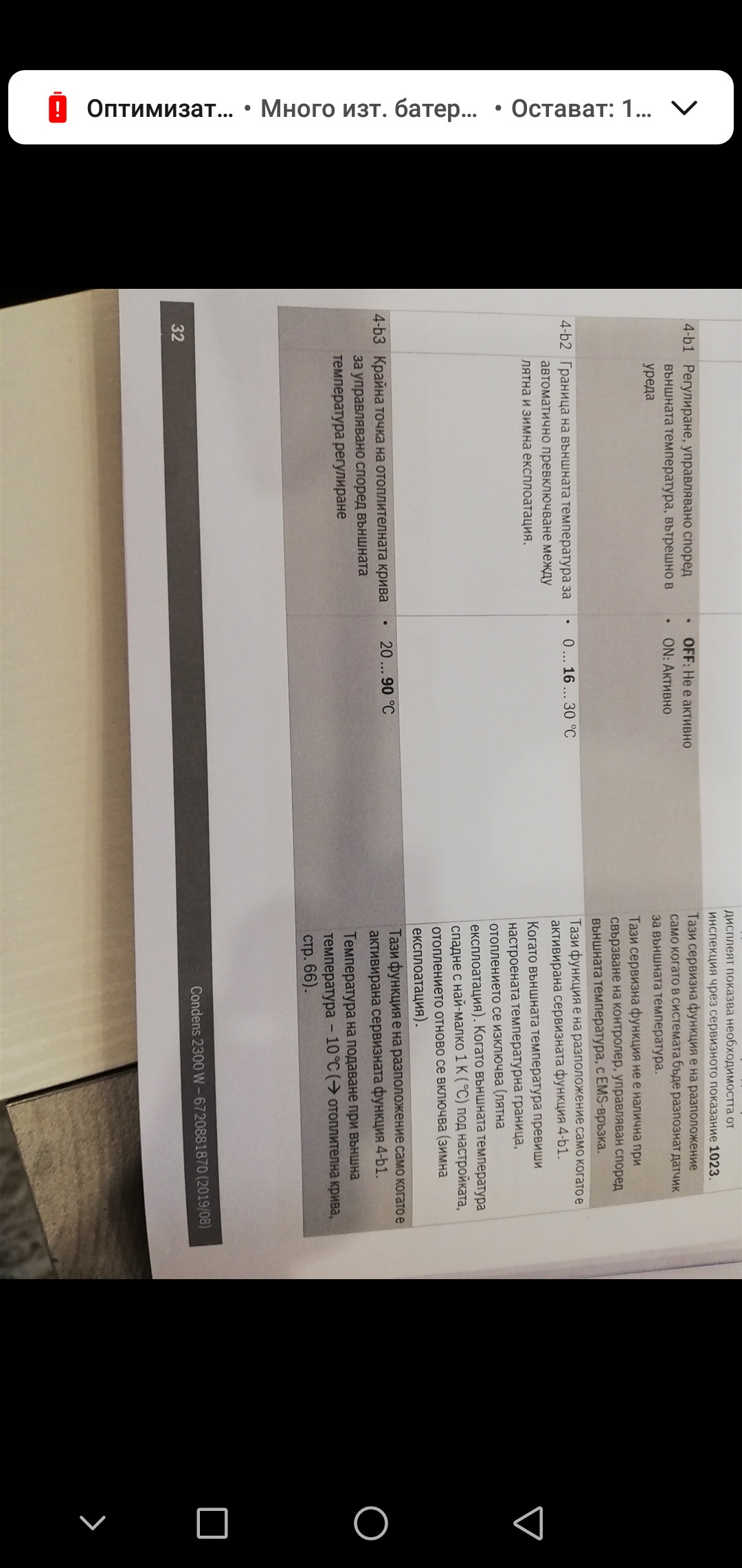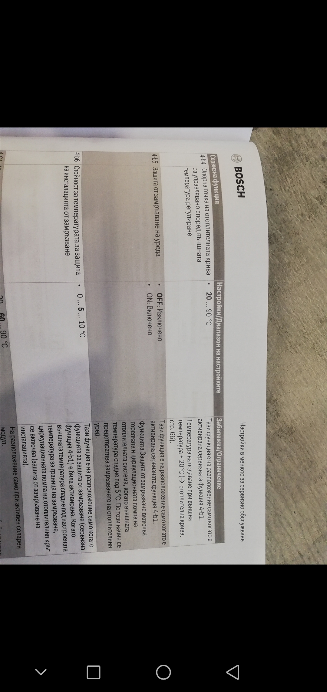 нед яну 10, 2021 1:47 pmLazarGanev написа: За кривата не си ги разбрал нещата. Начална точка - това е изчислителната температура, при която се изчисляват топлозагубите са съответния регион. За Варна е -11, за София -15*С. Крайната точка е максималната точка, при която искаш да има отопление - обикновено се избира 20*С. Минималната температура на подаване, това е температурата в крайната точка - например при външна температура +20*С искаш да ти подава в радиаторите 30*С. Максималната температура на подава ще бъде при началната точка - избира се според големината на радиаторите. В твоя случай пробвай с 60*С, после можеш да коригираш. Засега остави всички термоглави отворени, но спъни максимално двата радиатора от секретните вентили - затваряш ги докрай и после ги отваряш на 1-1,5 оборотаЗа кривата - опитах се да коригирам, но 20 градуса е минимума, който ми позволява да задам за начална точка. Съответно 75 е максимум за крайна. Пробвах да намаля максимума(позволява до 40 градуса), но въпреки това не ми позволява началната да е под 20. И за тези легендарни секретни винили (всички за тях говорят), възможно ши е да са толкова секретни, че да не ги намирам?