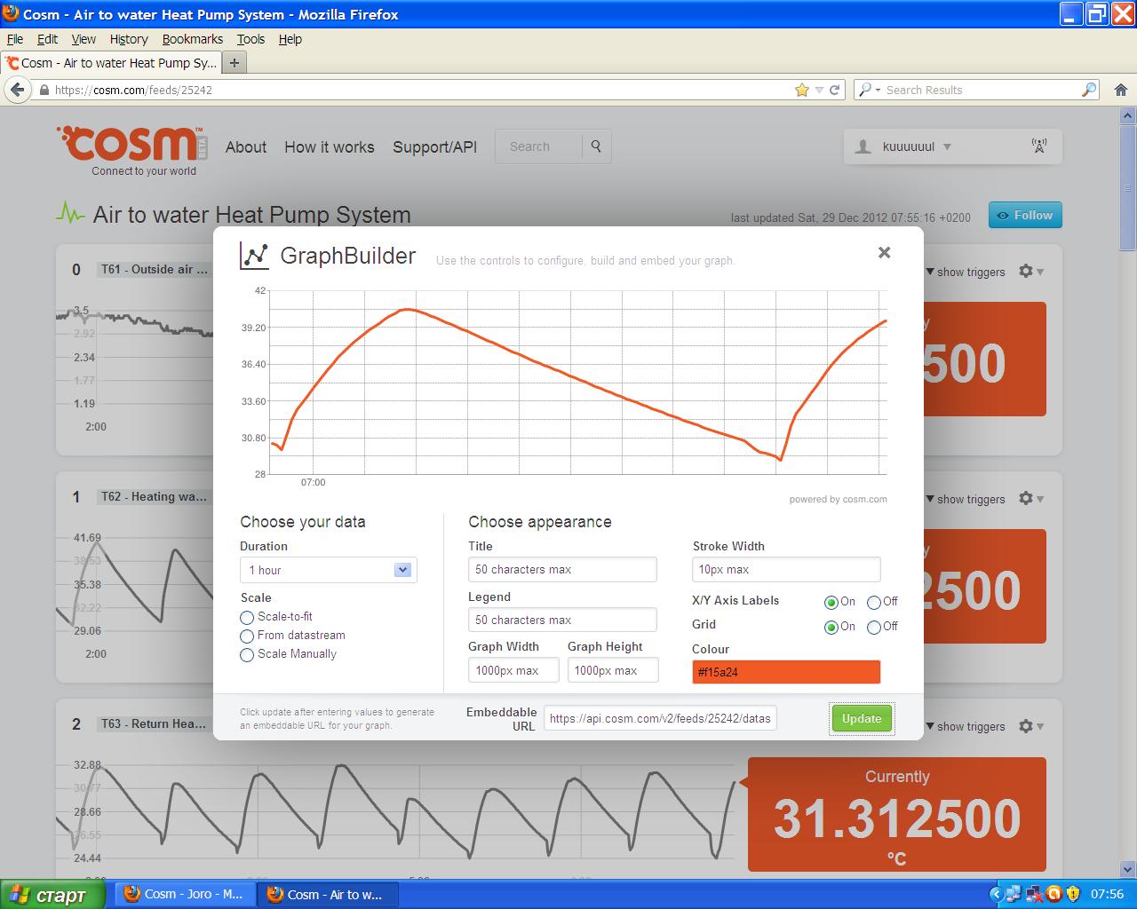 Гледам на графиките от днес,имаш падове на тем. на под. вода до 0гр.Предполагам че са при дефрост :? ако е така значи може и да е замръзнал,на мойта съм задал да размразява до 20гр. на водата и за всеки случай съм с антифриз.Друго което ми прави впечатление е цикъла на работа 25мин. работи и 33мин. почива и подав. вода е в границите 33гр-46гр съответно при мен са 6мин./12мин. и 28-36гр разход 1,5кв/ч (240w за помпите).Правил ли си опити с други температури и какъв ти е разхода средно на час?