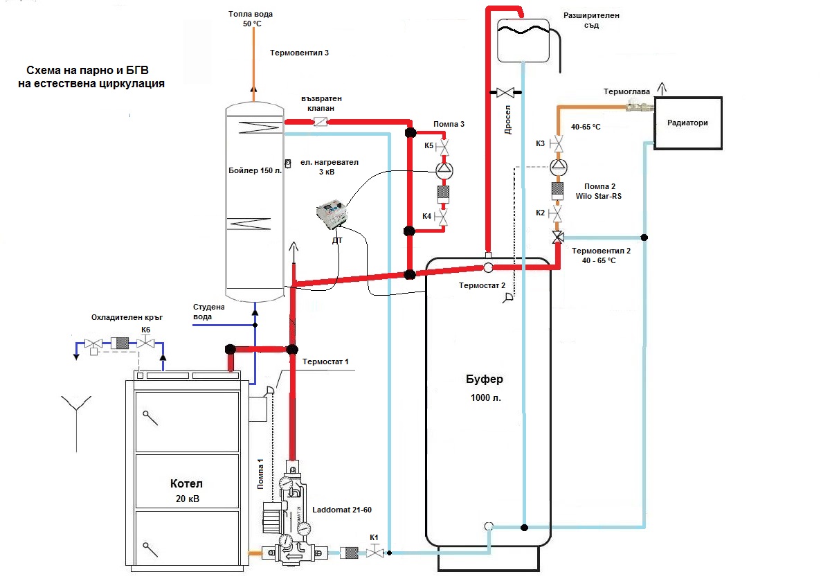 3. Като имаш помпа 2, коя е 1, тази на ладомата ли? Та когато работи ладомата той ще върти водата в горната серпентина на бойлера, като се напълни буфера и спре трябва да разчиташ само на гравитацията. За целта бойлера физически трябва (както правилно си го начертал) да е над двуметровия буфер, имаш ли толкова високо помещение за котелно или ще го слагаш на горния етаж? Имай предвид, че гравитацията трябва да преодолее голямото съпротивление на серпентината плюс това на възвратната клапа, в крайна сметка ще получиш недостатъчен дебит и бавно затопляне.