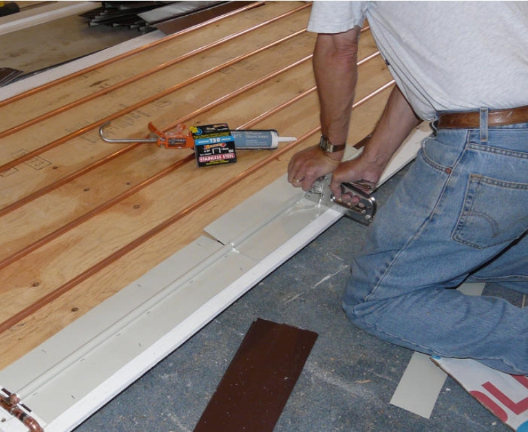 По принцип като правят самоделни колектори с мека алуминиева ламарина, обикновено се поставя решетка от медни тръби върху някаква основа, например ОСБ и се наковава отгоре ламарината плътно около тръбите с малко силиконова паста между тях: