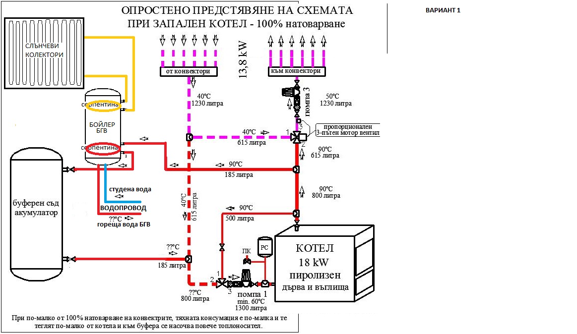 Преди години, когато започнах от единия край с изграждането на отоплителната си инсталация дори не си и помилях за това, което ще напиша по - долу, но факта е, че изпълних посочената схема /два поста нагоре, т.е. тази от 1 ва страница/ ако не на 100 то на 99 %, работата на котела се промени коренно!!! Системата стана изключително инертна и плавна, разхода на въглища намля драстично, да не говорим за комфорта в помещенията!