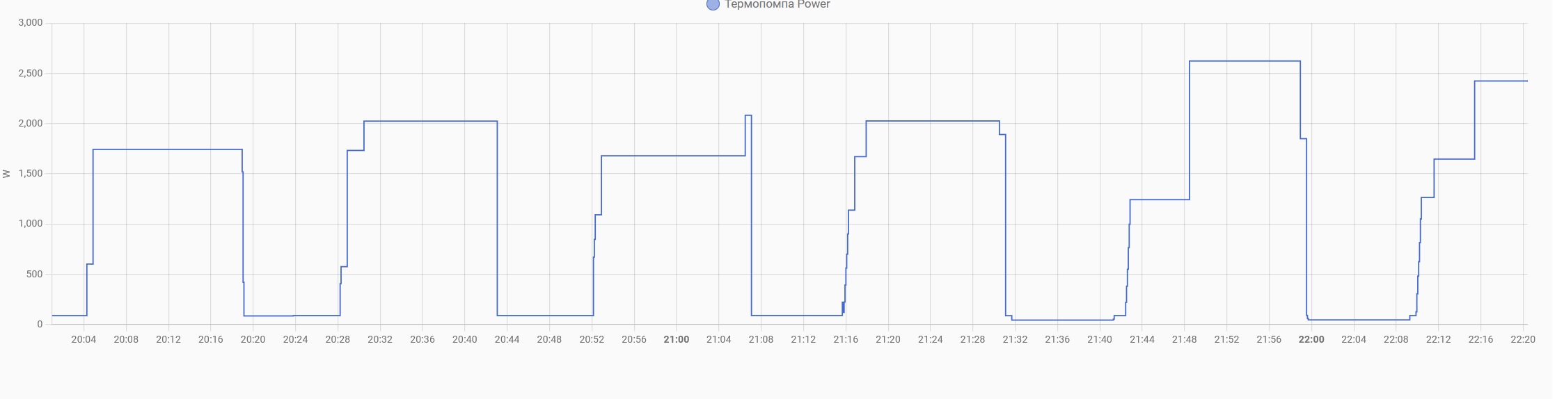 Ето и мойта графика от HomeAssistant и не е много точна като мощност. Дига мощността до 2800W на няколко стъпки и после почива. За 2ч има 5 пуска. Не знам кое и е инверторното така като гледам......