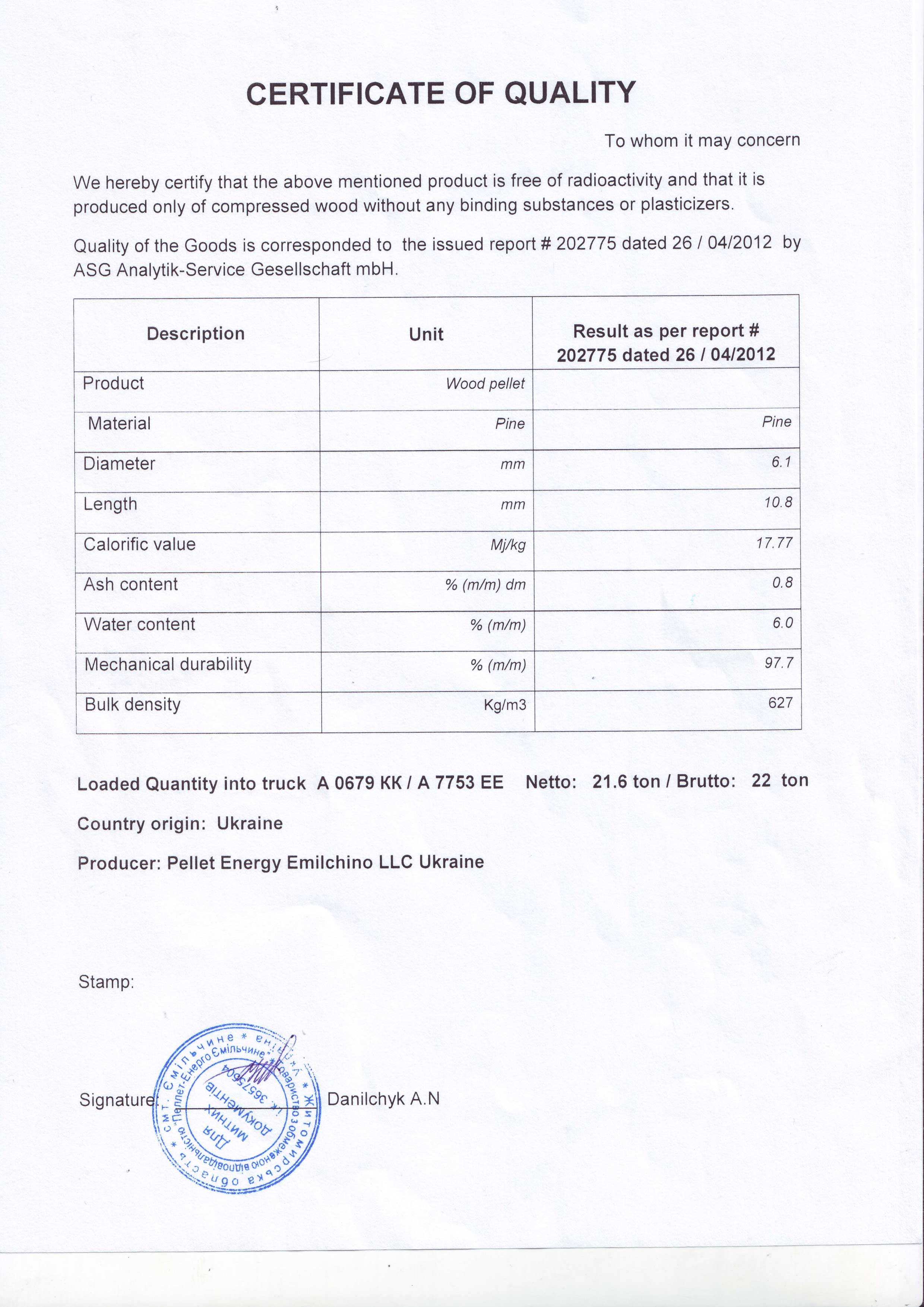 de_marco написа:По принцип висококалоричните пелети са с калоричност около и над 18 MJ/kg. така че е напълно възможно да Ви хареса КПД-то им. От друга страна може би това би трябвало да е ключовия показател при закупуването им, просто защото по този начин се компенсира разликата в цената.За Украинските пак питах, твърдят че са 100% иглолистни. Поисках да ми пуснат сертификата по мейла. Като го получа ще го кача в форума.