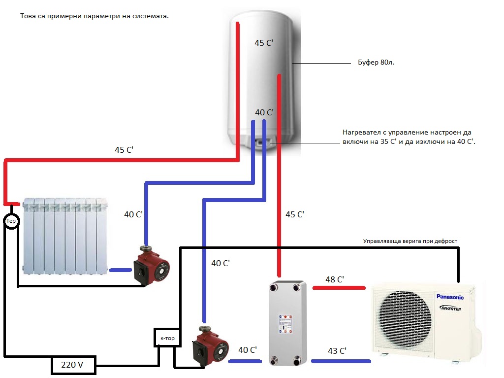 На термопомпата от схемата по-долу ми беше GEA WP4-40, 1.3 m2. Двойно по-голям от необходимия. Работеше идеално!