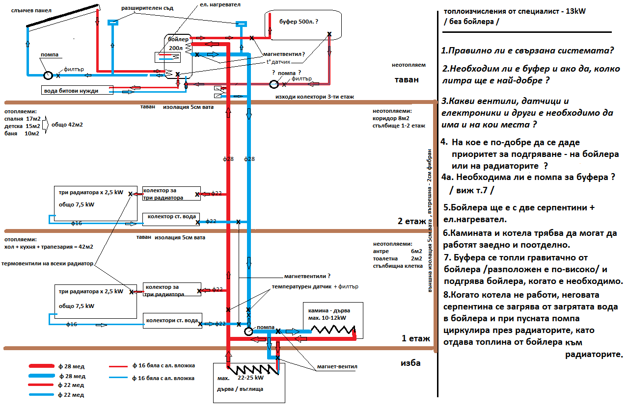 Здравейте, предстои ми изграждане на инсталация за отопление на еднофамилна къща. Къщата е нова и предстои да се маже отвътре, така че, сега е моментът да изградя инсталацията. Къщата е на три етажа по 66м2 всеки, като на първия етаж ще отоплявам хол, трапезария и кухня- без прегради между тях, общо около 40м2. Втори етаж -спалня -17м2, детска - 15м2, баня - 10м2. Третия етаж е таван и на този етап няма да се отоплява. Кащата е с външна изолация каменна вата 5см, и вътрешна фибран 2см, а на таваните на всеки етаж - вата 5 см. Имам направени топлоизчисления от специалист, според които ми е необходима мощност от 13kW /тук не е включен бойлер/. Прилагам схема за изграждане на инсталацията. Моля за конкретни мнения и коментари от хора, които разбират от това. Засега идеята е да изградя инсталацията и да монтирам камина и соларна система, а на по-късен етап /като имам свободни средства/ да добавя котел, а след това евенуално и буфер. След буфера може да добавя още соларни тела, но това е идея за далечното и светло бъдеще.