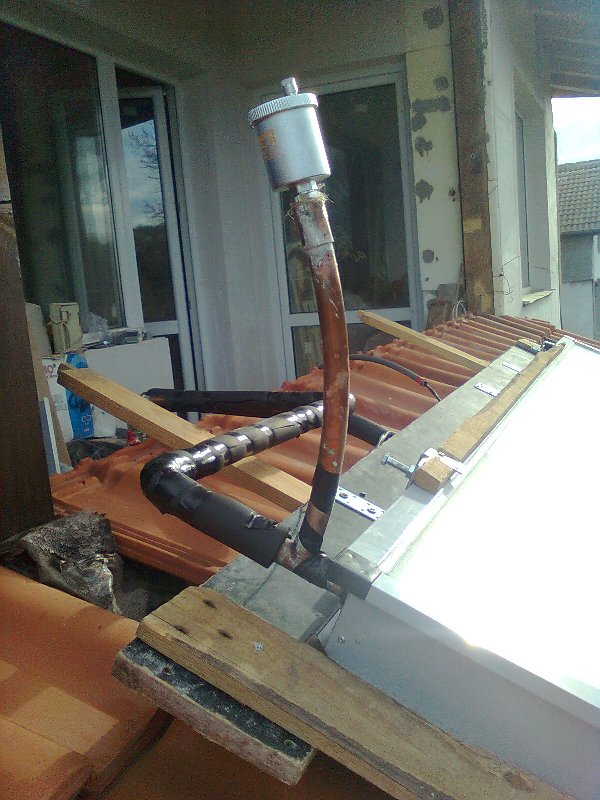 Ами все още не смея да я напълня с гликол, че има течове. Като ги изчистя ще го мисля. Смятам пълненто с гликол да го оставя за есента. Малко сълзи на една от спойките преди разширителния съд (12 л за слънчеви инсталции напомпан е на 2.5 атмосфери - проверено с манометъра от колата). Не съм много наясно какви са добрите настройки на Интиела. За там ще ми е нужно време за да го разбера как работи и да го нацъкам. Останах с впечатление, че след като помпата се изключи остава повече от нужната топла вода из тръбите, а тя изтива до следващото развъртане на помпата. Има какво да се оптимизира. Още не съм довършил и изолацията на тръбите, но все пак един от предните дни, в които имаше повече слънце стигнах до 44 градуса на 120л бойлер, което за мен си е някакъв успех.