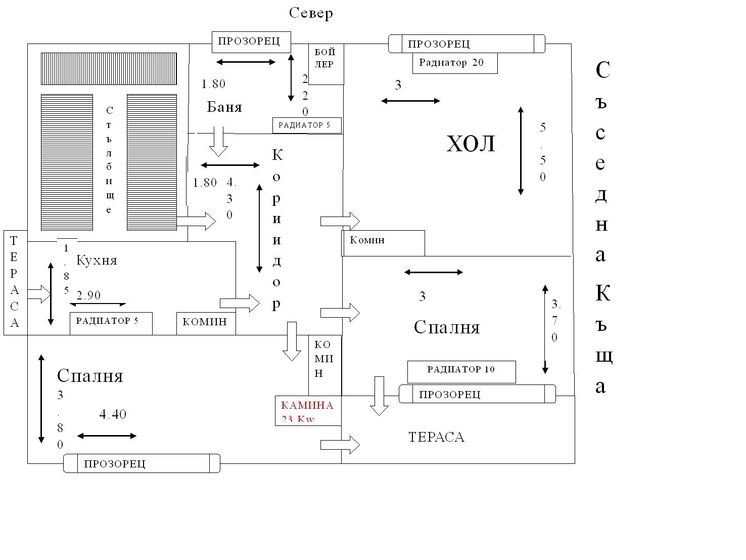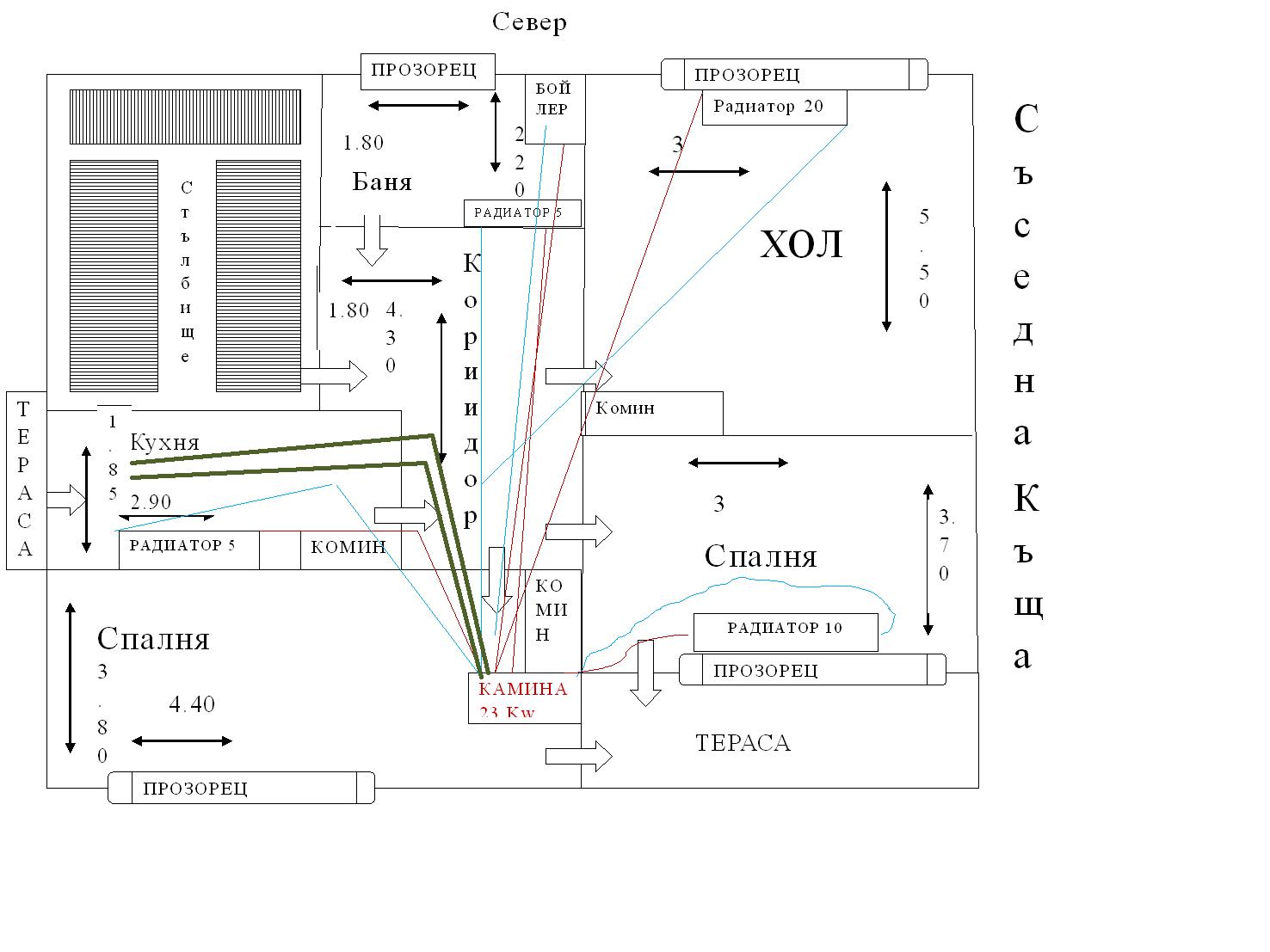 Изготвих схема Въпроса ми е ще успея ли да се стопля зимата Къщата е със сменена ПВЦ дограма и стъкло пакет без изолация. Целта ми е температурата да се движи в рамките на 22 -27 градуса , дърва ще се слагат колкото е нужно.