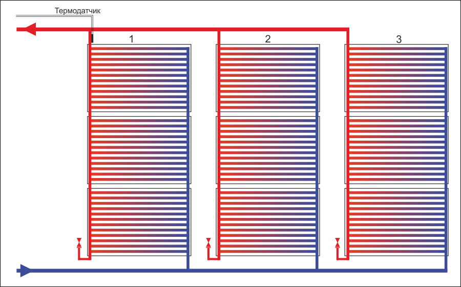 На скицата колекторите се гледат от горе (от небето) - Дясно - юг, ляво - север, монтирани на една височина на плосък покрив едни зад други. Колектор №3 прегрява. Свързването на инсталацията правилно ли е? Тръбите са полипропиленови - магистралата 32мм, отклоненията към панелите 25мм. Бойлерите, помпи, управление... са в мазето. До покрива има 5 етажа или около 16м деневилация. При работеща помпа налягането е около 2,5атм. (маск до 3) Системата е пълна с течност за целта - гликол-нещо си. При изпускане на въпросната течност излиза и странна черна субстанция - като остане на сухо се сгъстява като кал, като се полива с вода се разнася като пясък. Имат съмнения, че тази субстанция може да прави тапи. Ако схемата на свързване се преработи така, дали ще има подобрение
