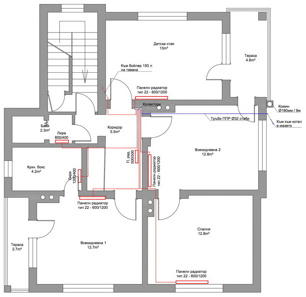 Радиаторите няма да са под прозорците за да си спестя доста къртене, единствено в спалнята ще е под прозореца, но там съм правил ремонт и заложих чакащи тръби.