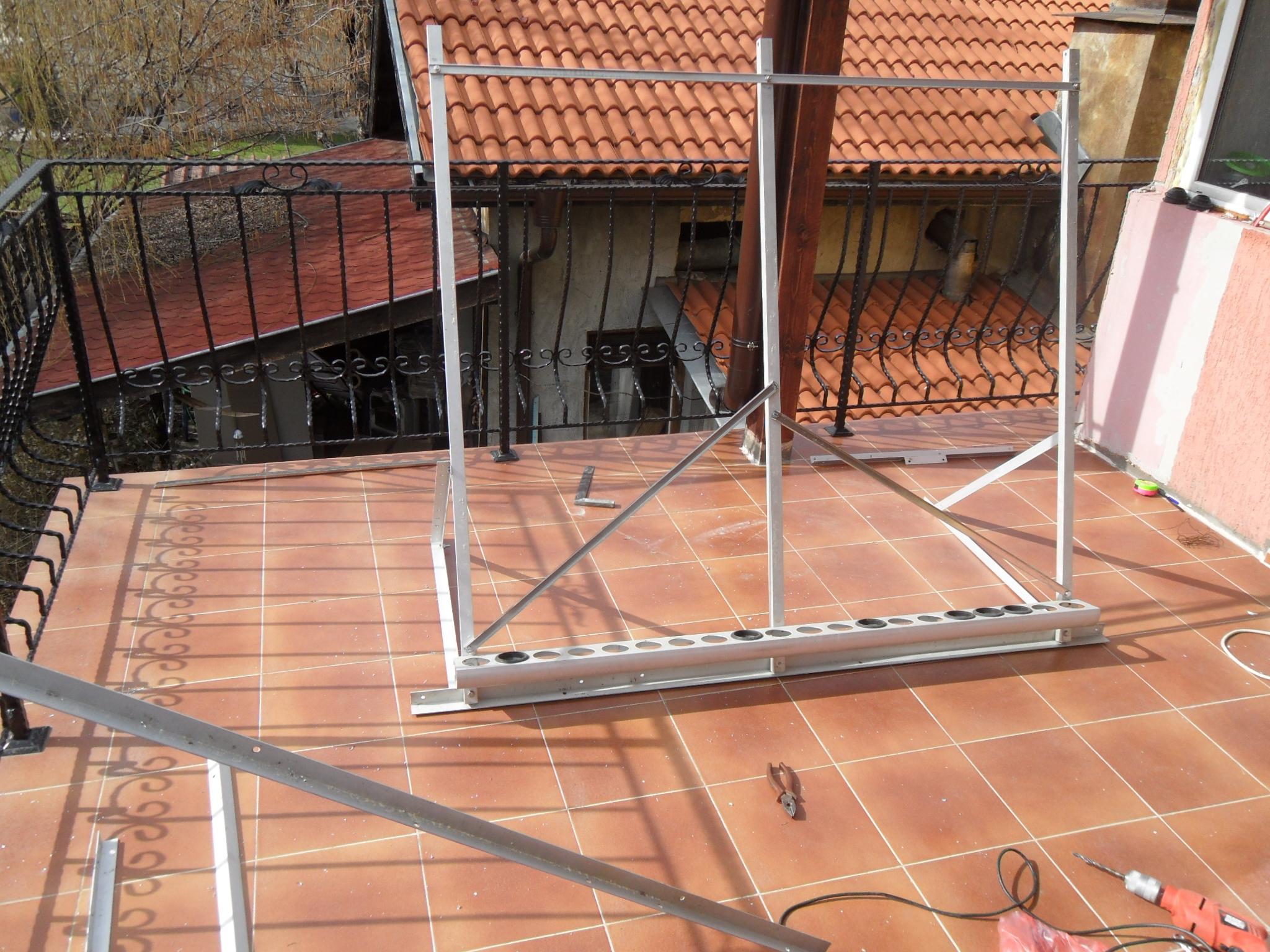 SAM_7300.JPG стойката е готова за монтаж на вакумните тръби. В горната част съм приспособил ивица гуменотекстилна транспортна лента с легла за тръбите