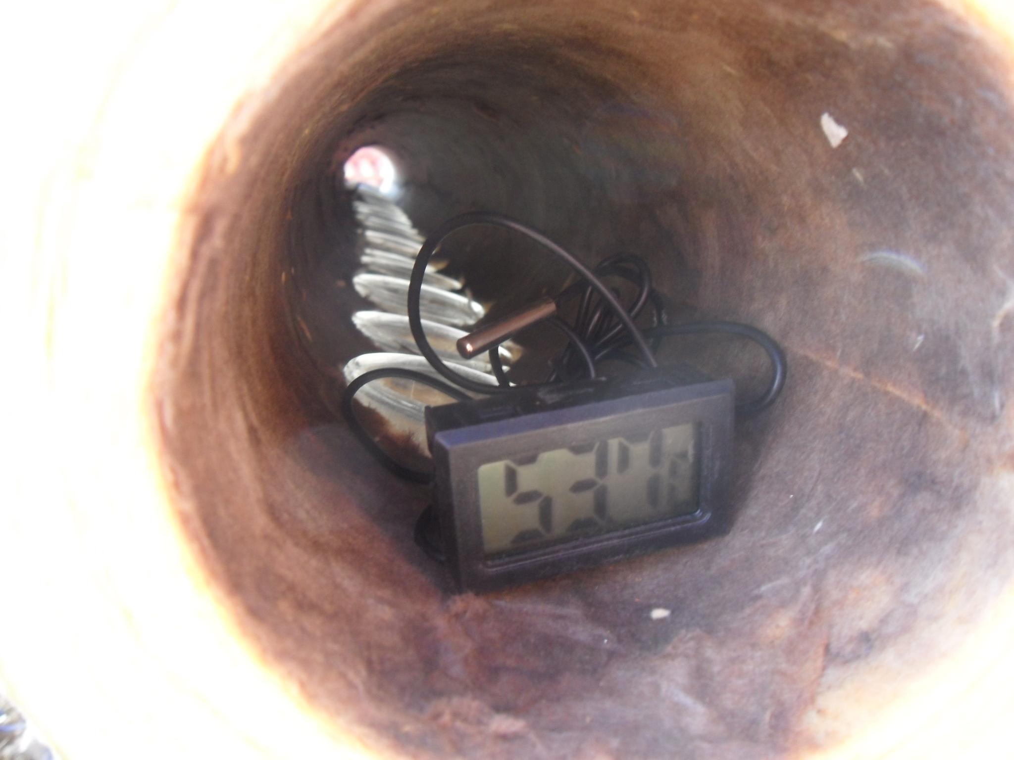 За проба днес към 16 часа сложих един диг термометър в колектора. Въпреки силният вятър и двустранният проход на колектора температурата се вижда.