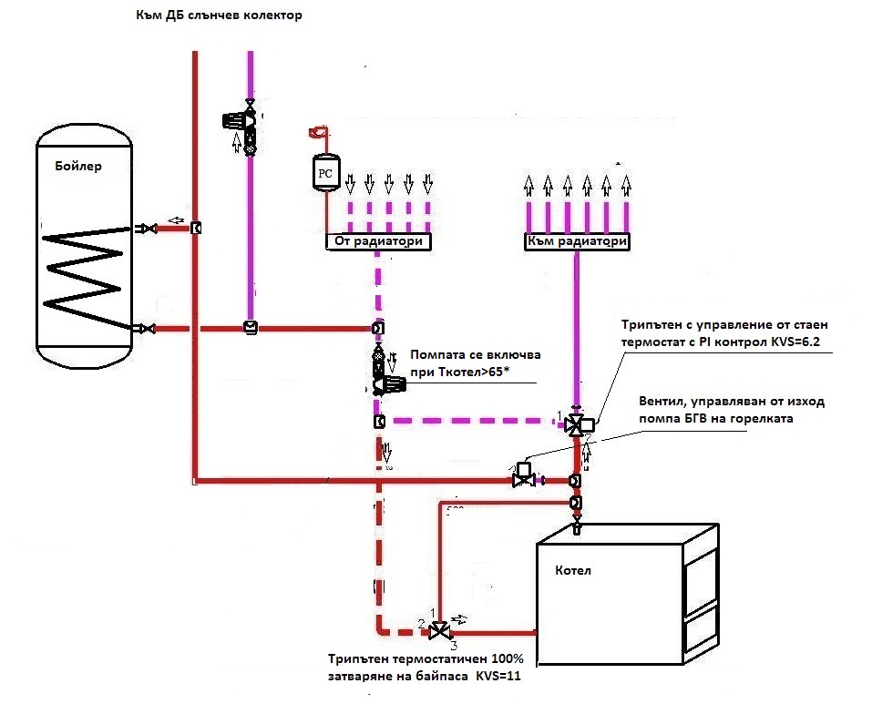 Базирайки се на тях сътворих следната схема: Тъй, като все още не съм се решил на програма максимум - и буфер засега, премествам помпата на връщащата линия. Така ще може да захранва бойлера при спрян или намлен поток към радиаторите. Вероятно ще трябва да изградя тази схема за да се види дали ще работи наистина според замисъла, но ако виждате нещо смущаващо, моля коментирайте.