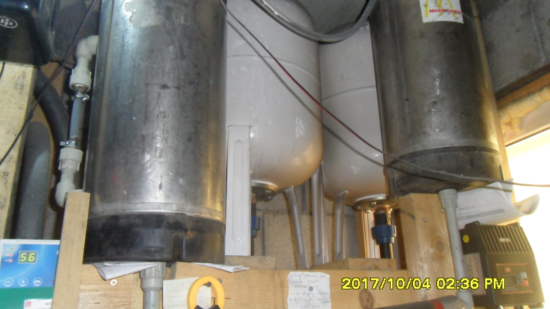 Четвърта снимка: Двата бели разширителни съда са х50 литра всеки и са буфери на хидрофора. Неръждаемите канти от безалкохолно са дрениращи съдове за соларите и нямат връзка с коментираното.
