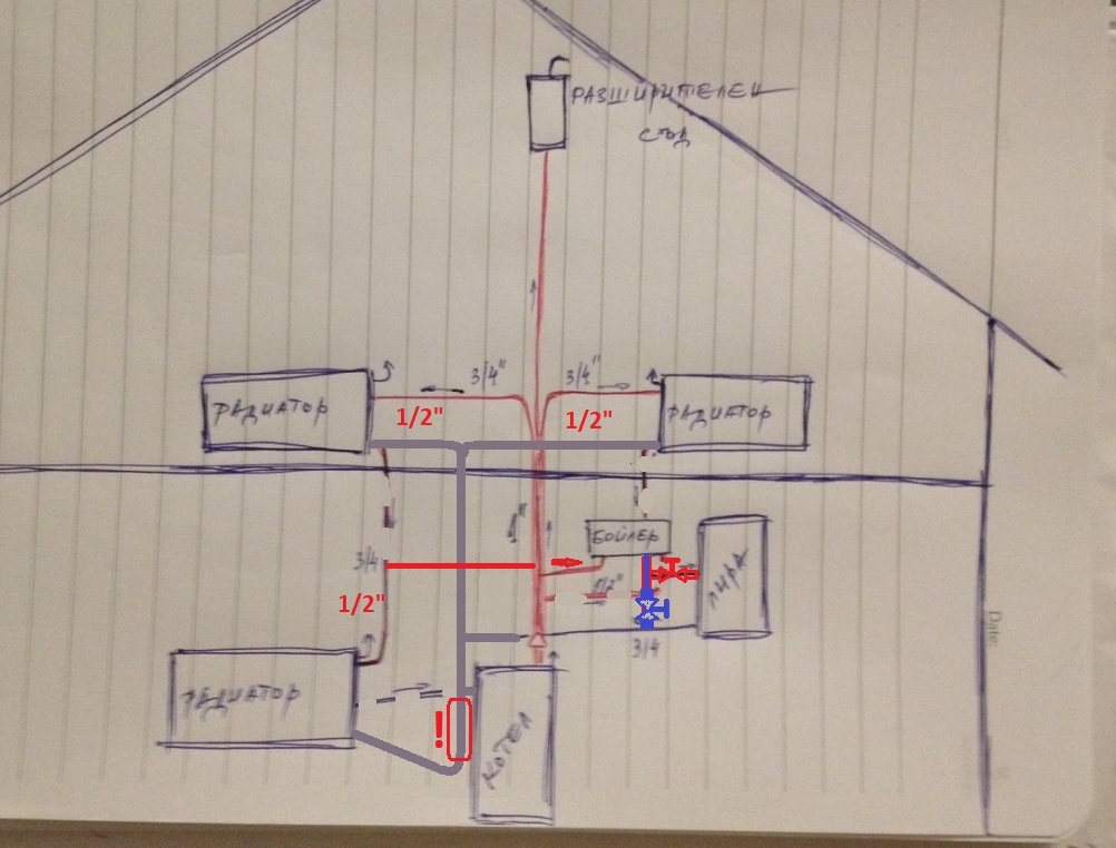 Обратния наклон на връщащата (от радиатора долу в ляво) не е желателен. При входа в котлето не е проблем да да имаш качване (с удивителната).