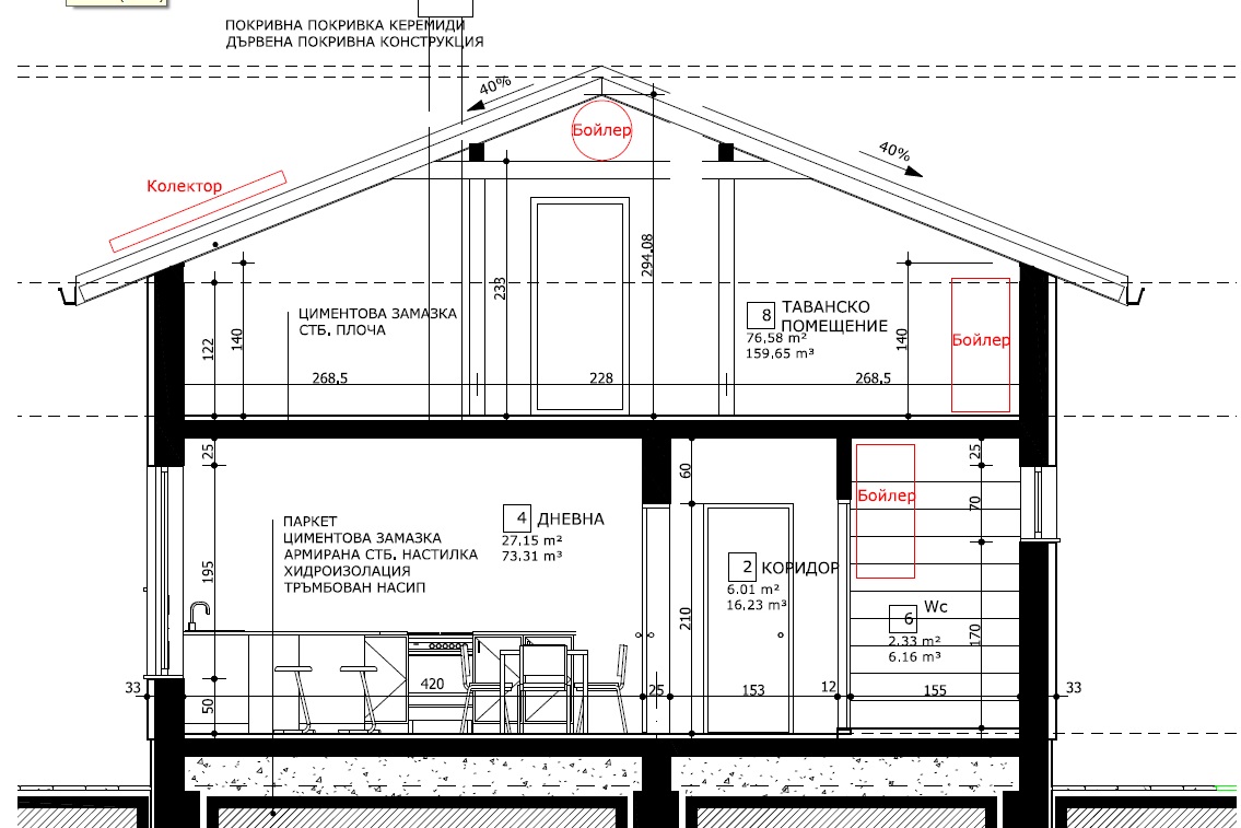 Ще пусна и тръби стаби от колекторната кутия до под прозорците евентуално ако реша да слагам конвектори или радиатори за в бъдеще. Къщата е с двускатен покрив, едноетажна с тавански етаж, който на първо време ще се използва за склад. До него ще се стига посредством падаща таванска стълба, разположена в коридора. Смятам колектора да е в малката тоалетна. За изолация съм предвидил 10 - 12см. каменна вата или стиропор, фибран 5-6см под замазката на подовото, 5-6см фибран над горната плоча, 5см. вата и гипсокартон от долната страна на горната плоча и минерална вата между ребрата на покрива, като ще я задържа с някакви тънки летви например. Таванското няма да е отопляемо, но и не искам да е съвсем студен таван. Дограмата е 5 камерна 72мм профил, троен стъкло пакет (4с/б/к). На първо време, няма да има охлаждане или най – много един конвектор във всекидневната. Идва въпроса и за топлата вода… Ще започна с малко изходни данни: В момента сме двамата с жената и бебе на 2 год. Живеем в апартамент, имаме 80литров бойлер на ток, който работи на нощна тарифа от 4 до 6 сутрин с програматор и за един час следобед и съм сметнал, че към настоящия момент средно ни отиват по 30 - 35 лв на месец енергия за топла вода. Къпем се и тримата всеки ден и нямаме миялна машина. Вярно е, че сме доста пъргави в банята и аз и жената. Аз съм за 10 мин, а тя за 15. Тенденцията предполагам ще е потреблението да се увеличава. Искам да се възползвам от слънчевата енергия и да имам топла вода в къщата. Това искам да стане по рационален начин. Не искам инвестицията ми да се избие след повече от 10 години. Единия скат на къщата е ориентиран на юг. Тъй като термопомпата за подово е доооста нискотемпературна и не мисля, че ще може да вземе участие за топлата вода зимно време. Имам две възможни места за монтаж на бойлер. Обозначил съм ги на картинката в червено. Едното е вертикален бойлер в банята, а другия вариант е стоящ бойлер в таванското над банята. Не знам колко литра ще е добре да сложа. От доста от изчетеното от форума и по – конкретно от мненията на Лазар разбрах, че е добре да е по – голям… около 200л. да речем (таванското позволява и повече). Какви съвети бихте ми дали относно системата. Затворена, отворена, дрейн бек… В началото ми се въртеше в главата термосифонна система като бойлера да е залепен за долната страна на билото, а колектора да е на долната част на ската, но като че ли се разкандардисах. Иска ми се и тази топла вода лятото някак да мога да се възползвам от нея чрез пералнята и миялната машина, но за това предлагам да говорим по – нататък. Идеята ми е да се направи сравнително евтина като инвестиция инсталация, която ще задоволява нуждите на семейството ми. Идеята за отделна термопомпа само за топла вода през зимата не ми допада особено заради възвращаемостта на инвестицията. Ако е необходимо зимата бойлера ще се дозагрява на ток с програматор и контактор, монтирани в таблото. Къщата е 90 кв.м застроена площ и 72кв.м отопляема. Височината на помещенията ще е 2,60м. Горе евентуално може и да станат още две спални по 13 кв, но на първо време не са в уравнението. Като цяло сме по – студено любиви. Температурите, които ни харесват са 21/22 за всекидневна и 18 за спални. И не на последно място искам покрива да запази някаква прилична визия (без огромни ръждиви конструкции).