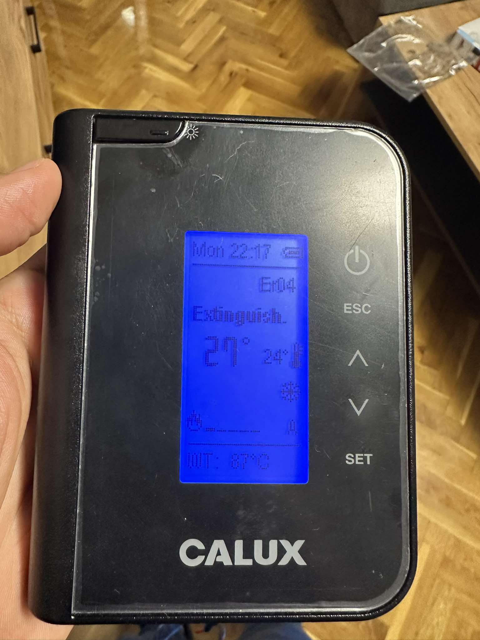 Камината в момента е настроена да работи по термостат. Доколкото разбрах, ако вдигне 4+ градуса на стайната температура трябва да влезе в `Stand By` режим докато не падне с 4 градуса под зададената (но не го прави). Говорих с фирмата и ми обясниха от системното меню, как да сложа камината да работи по температура на водата, не на термостата. След тази промяна камината започна да влиза в StandBy режим при достигната 40-44градуса температура на водата (което е прекалено ниско) и върнах настройката.