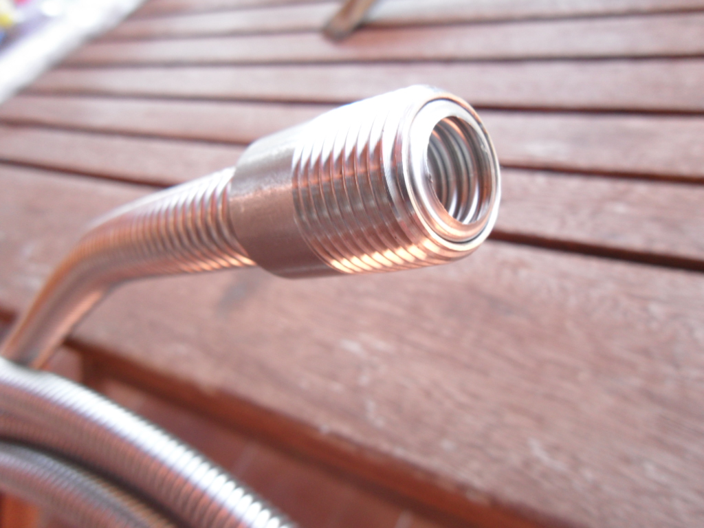 Дотук имаме неръждаем фланец и два заварени неръждаеми нипела. Следва запояването или заваряването на нипелите към гофрето.
