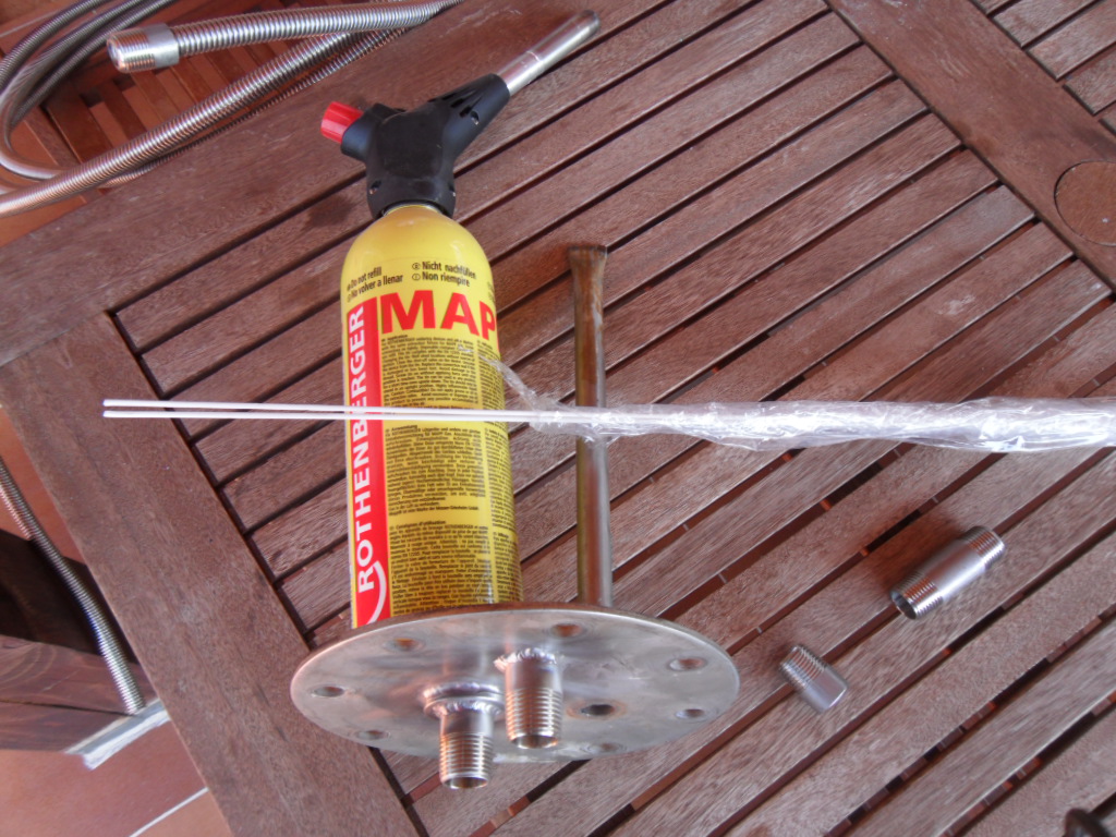 SAM_8312.JPG За всякакви спойки на неръждавейка и мед използвам евтина горелка с пиезо палене и високотемпературна газ. За любители, като мен е идеална:-) Припоя е различен в зависимост какво запоявам: мека мед на руло, твърда мед, неръждавейка и т.н. В случая използвам качествен сребърен припой с 40% съдържание на сребро.