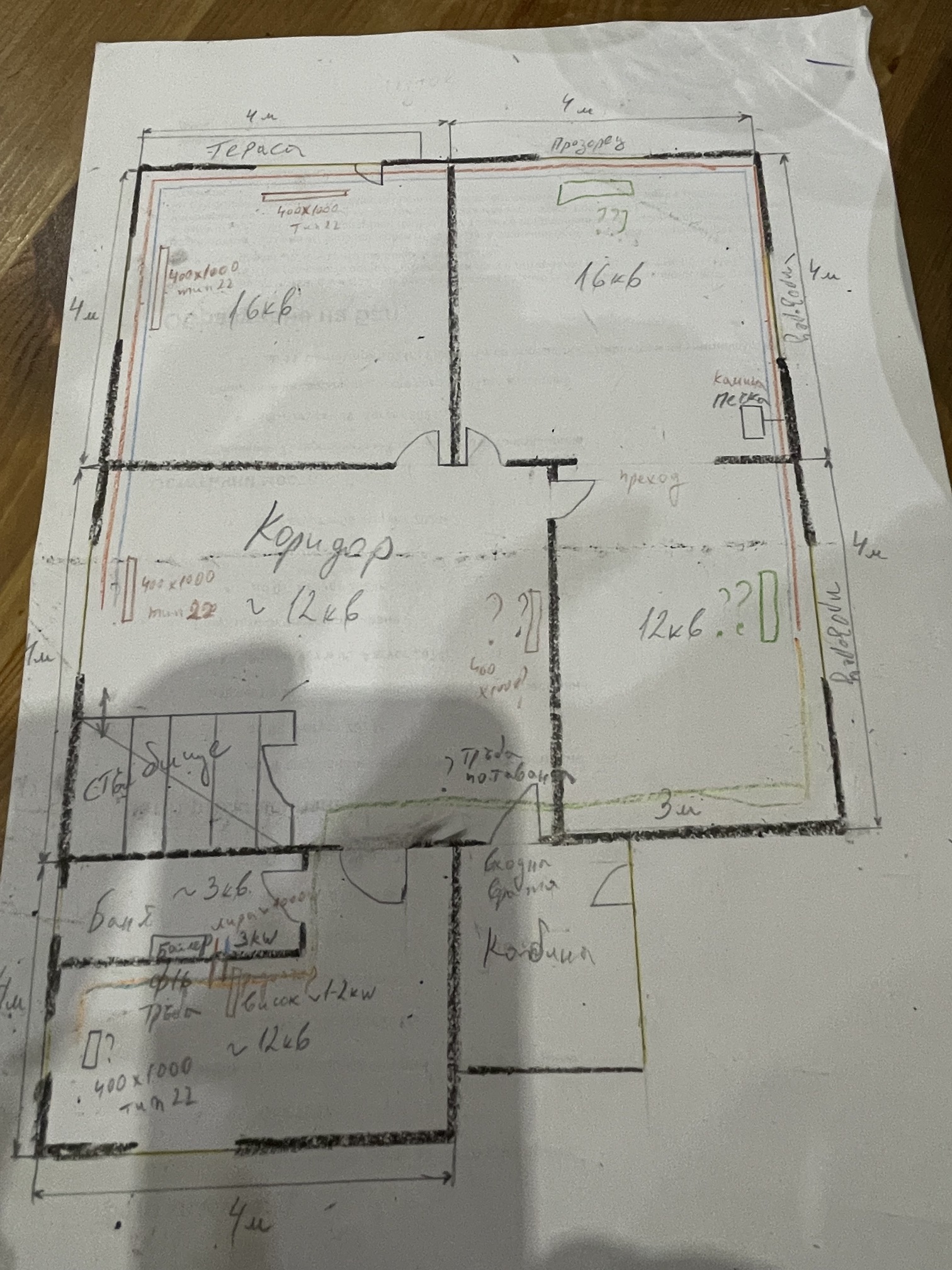 Имам желание да си направя парно с камина на дърва в къщата на село в родопите където ходим през почивните дни и празниците. Къщата е гредоред, каменни зидове ~50см без изолация. Преди време прекарахме тръби ф16 al pex до помещението където е банята и бойлера. Къщата е на 3 етажа а самото парно ще е на 2-ри среден етаж. Имам няколко въпроса за избор на каминна KW и избор на панелни радиатори тип22 или алуминиеви. Прилагам нарисувана скица да придобиете представа за помещенията и разположенията.