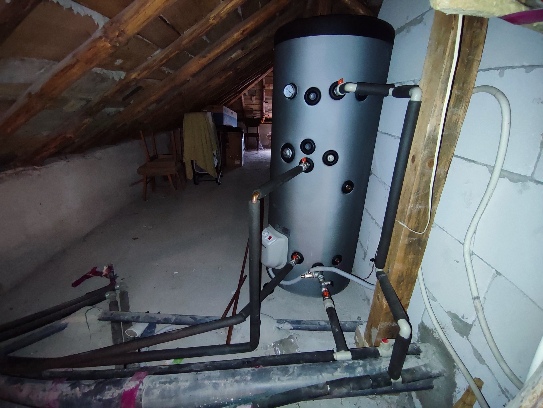 Здравейте! Имах изградена слънчева система от много години около 17 години, състояща се от един слънчев панел (не се сещам марката и бойлер sunsystem 100 литра. Нагряваше водата без проблем до 70-80 градуса, панела е поддържал лятно време 90-100 градуса. Сега добавих нов панел на Viessmann Vito 100 fm и премахнах стария бойлер от 100 литра и сложих стоящ бойлер от 200 литра на Eldom fv20060s2 (с две серпентини). Също така е сменен и РС, който е 12 литра. Панелите се намират на не повече от 1.5-2 метра височина от разширителния съд, бойлера е на същото ниво на разширителния съд, тоест цялата инсталация е на таванското помещение. Трасето на тръбите е около 26-27 метра медни тръби на 15мм и някаква част от 18мм. Имам помпена група също, помпата е на режим Auto. Имам контролер Intiel 3.1 DT-3.1. Течността в панелите достига до 90-100 градуса, а може и повече, но водата в бойлера не се нагрява повече от 62 градуса, в повечето случаи 55-60 при положение, че през деня е имало слънце (очаквах нагряване като преди 70-80 градуса). През деня на манометъра на помпената група достига 2.8 бара, а вечер и сутрин на студено пада до 0.7 бара. Сутрин на студено в разширителния съд налягането е около 3 бара измерено с манометър. Има ли някъде нещо сгрешено? Обмислям да сваля налягането на системата до 0 бара и да напомпя с въздух разширителния съд до 1.2-1.5 бара на студено и след това ако се налага и системата до 1.5-1.8 бара. Прилагам снимки на системата.