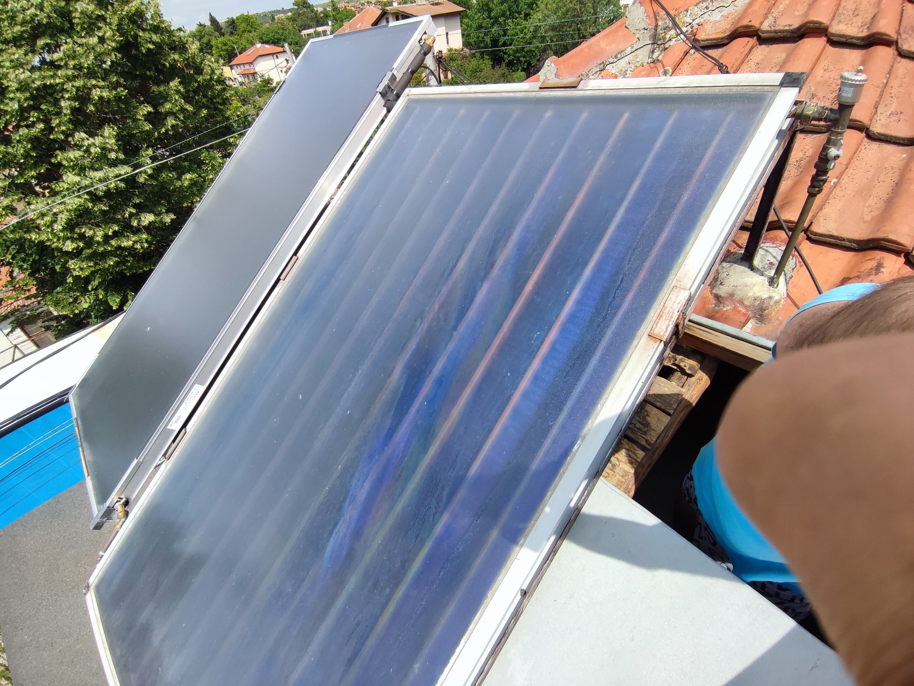 Здравейте! Имах изградена слънчева система от много години около 17 години, състояща се от един слънчев панел (не се сещам марката и бойлер sunsystem 100 литра. Нагряваше водата без проблем до 70-80 градуса, панела е поддържал лятно време 90-100 градуса. Сега добавих нов панел на Viessmann Vito 100 fm и премахнах стария бойлер от 100 литра и сложих стоящ бойлер от 200 литра на Eldom fv20060s2 (с две серпентини). Също така е сменен и РС, който е 12 литра. Панелите се намират на не повече от 1.5-2 метра височина от разширителния съд, бойлера е на същото ниво на разширителния съд, тоест цялата инсталация е на таванското помещение. Трасето на тръбите е около 26-27 метра медни тръби на 15мм и някаква част от 18мм. Имам помпена група също, помпата е на режим Auto. Имам контролер Intiel 3.1 DT-3.1. Течността в панелите достига до 90-100 градуса, а може и повече, но водата в бойлера не се нагрява повече от 62 градуса, в повечето случаи 55-60 при положение, че през деня е имало слънце (очаквах нагряване като преди 70-80 градуса). През деня на манометъра на помпената група достига 2.8 бара, а вечер и сутрин на студено пада до 0.7 бара. Сутрин на студено в разширителния съд налягането е около 3 бара измерено с манометър. Има ли някъде нещо сгрешено? Обмислям да сваля налягането на системата до 0 бара и да напомпя с въздух разширителния съд до 1.2-1.5 бара на студено и след това ако се налага и системата до 1.5-1.8 бара. Прилагам снимки на системата.