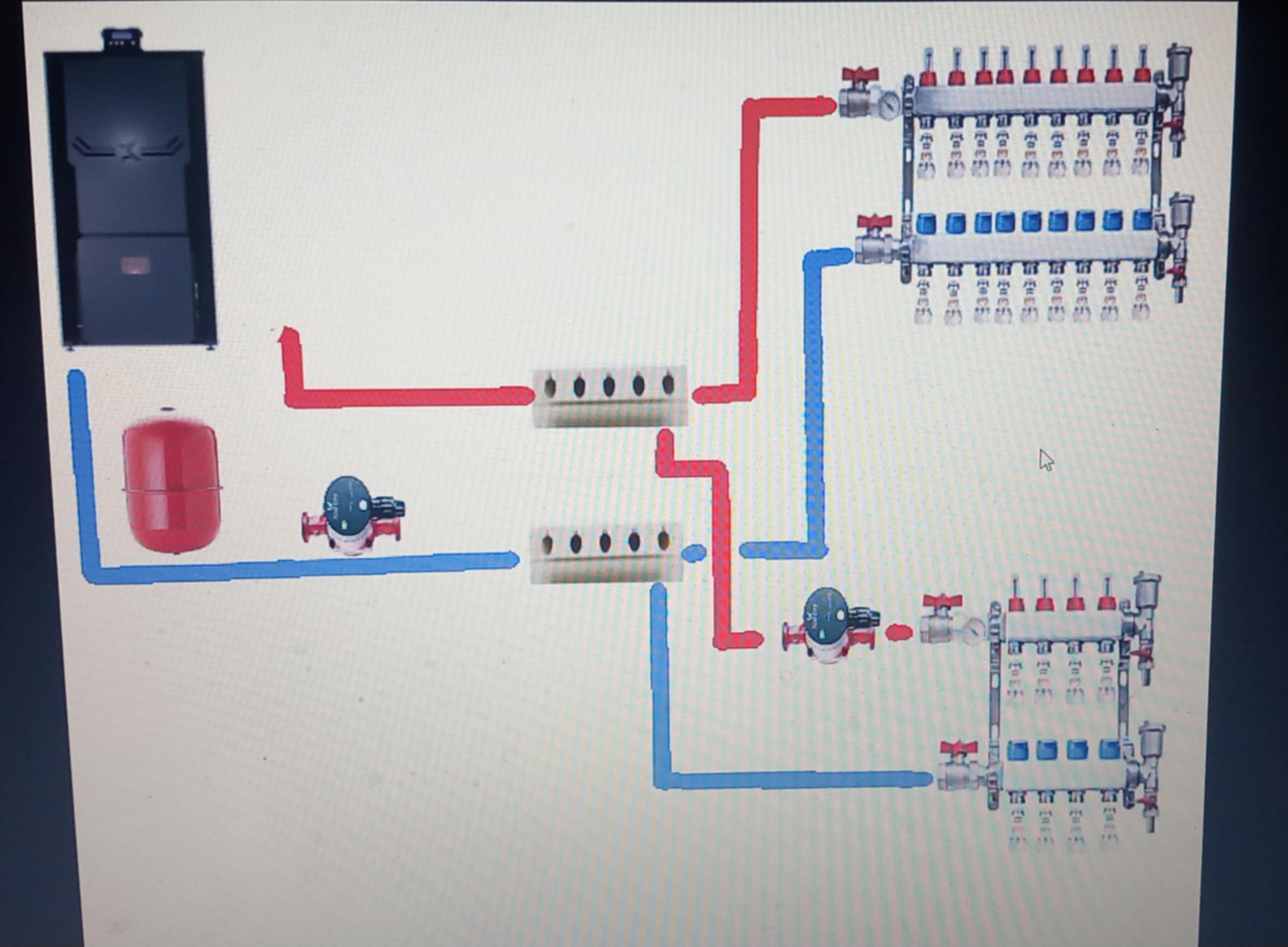 Чукча не читатель, чукча писатель! Преди да вземе човек да твори, не е ли по-добре да прочете и да се поинтересува за готови работещи и препоръчителни схеми. Жокер - котелът на твърдо гориво не трябва да работи с температура под 60°С (даже над 70 е добре да бъде(, а подовото трябва да работи с температура около 35°С. Необходим е малък буфер или поне хидравличен изравнител, една помпена смесителна група за котела и една или две (за всеки колектор) помпени смесителни групи за подовото. Всичко друго е БРАК