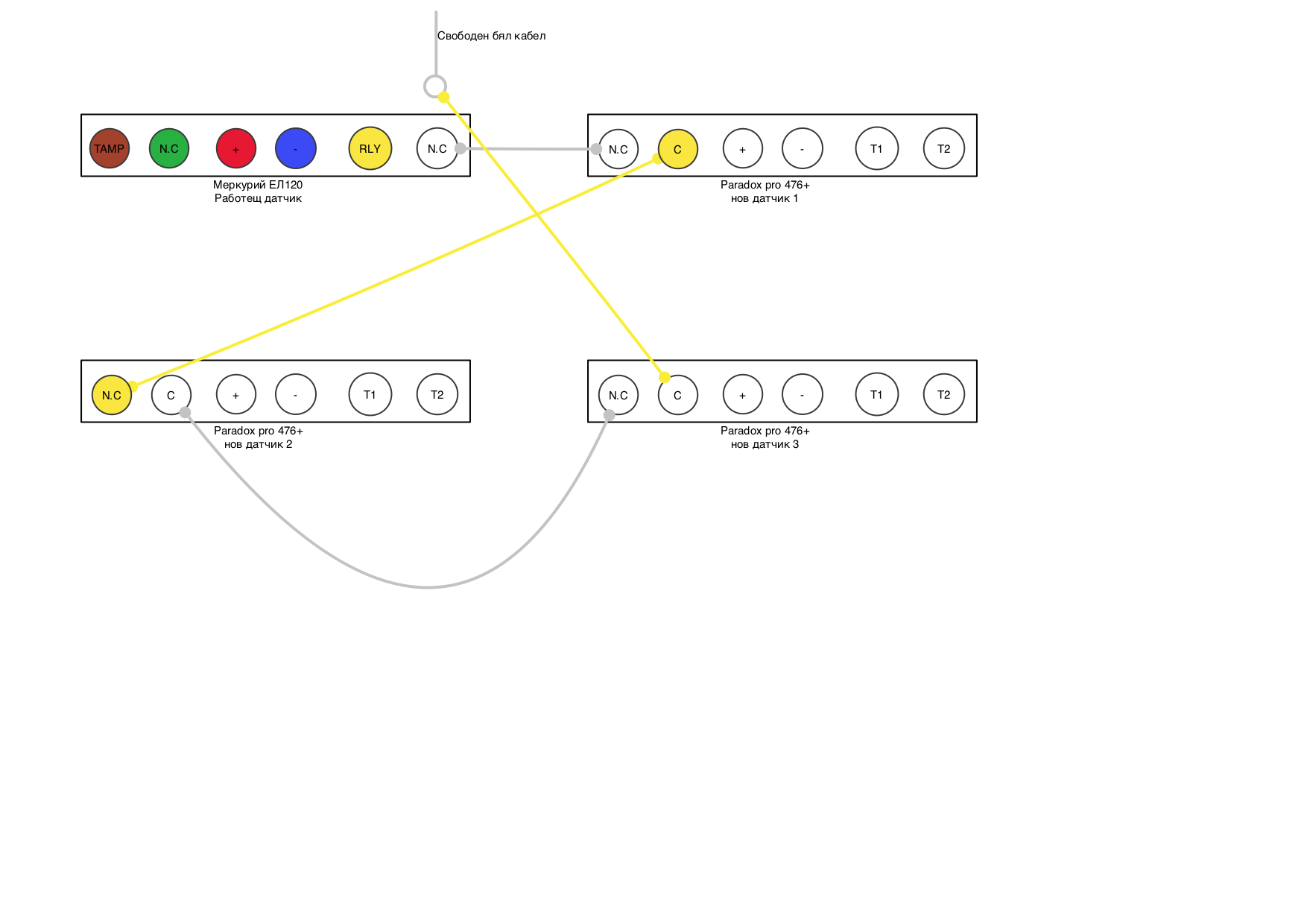 Ето така. Тамперите са една върволица и релетата са друга върволица. Началото и края на всяка започват и завършват в централата. Няма значение на тампера и на релето коя клема ще е вход и коя изход. Ако искаш свържи цветовете в друг ред стига логиката да е същата.