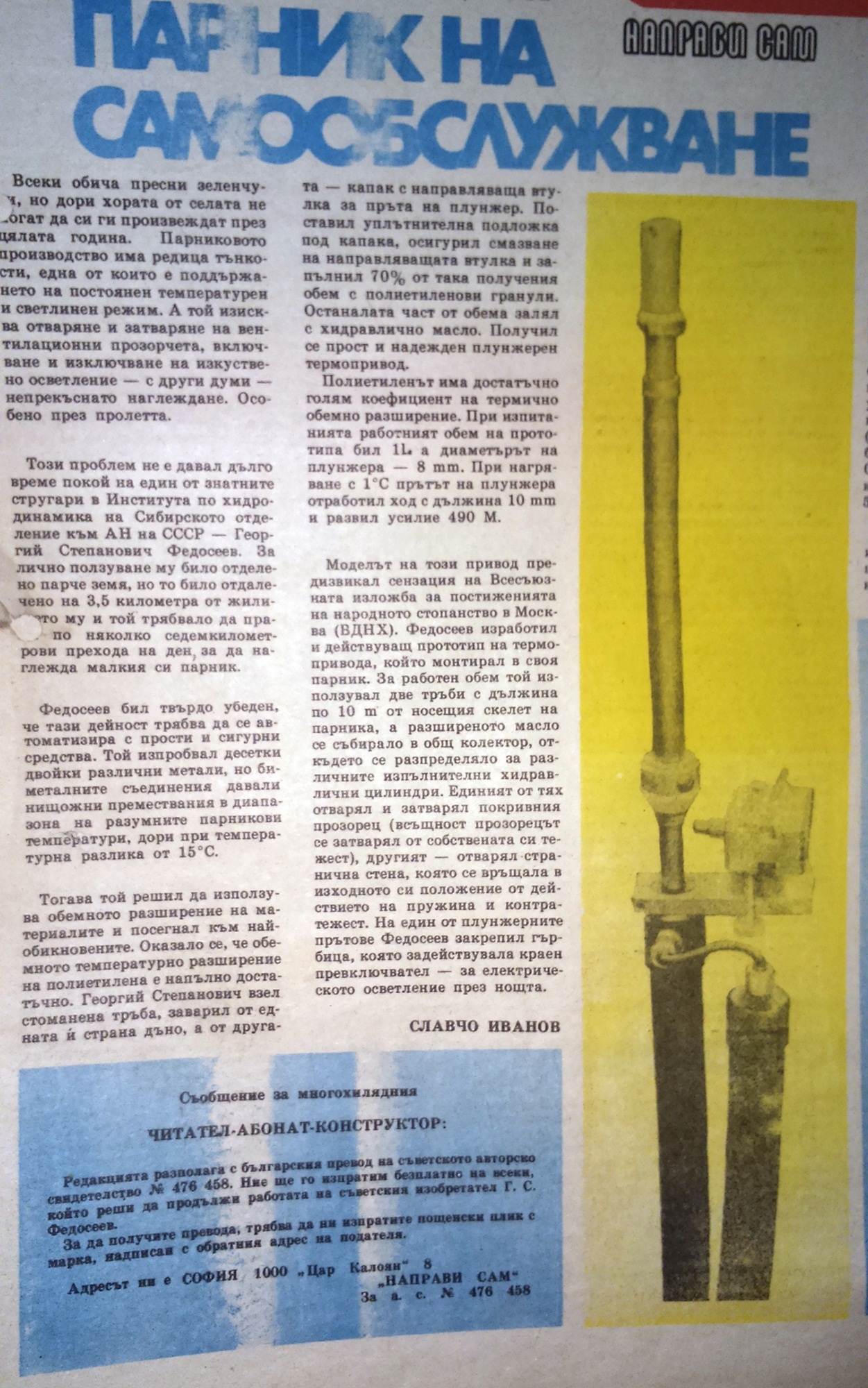 a_stoev написа:Май не си погледнал линка от хидразин. За какво ти е да правиш нещо в пъти по-скъпо, дето иска ток и е не надежно заради многото елементи в него, вместо отдавна откритата "топла вода"?Погледнах го, дори имам същото нещо, което отваря един от прозорците в парника. Но не е достатъчно. Ако си загледал това устройство е приложимо на вертикално отварящи се прозорци на покрива на парника. Моите са хоризонтални и при отваряне от 1 педя, топлия въздух си остава в парника. Затова искам да се отваря цялата врата.