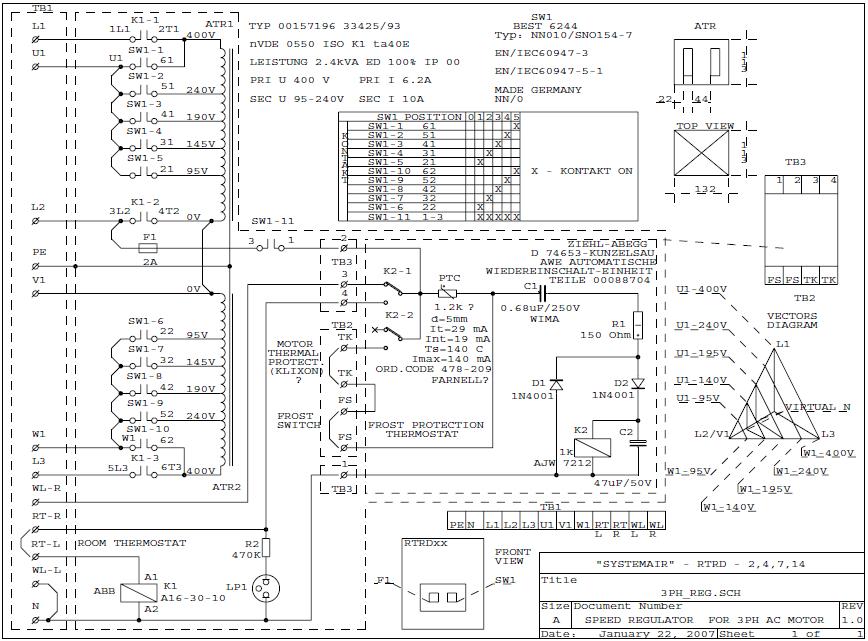 Схемата е изпълнена с два монофазни, степенни автотрансформатори за 400V, всеки свързан между регулируемата фаза и третата, която не се регулира, и чиито степени се превключват синхронно.