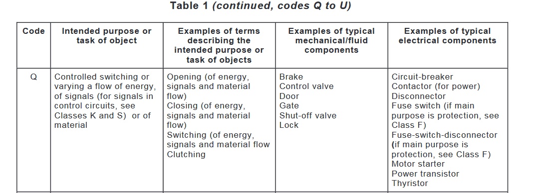 По един стар стандарт IEC 60750:1983 последван от IEC 61346:1996 и предпоследния стандарт IEC 81346-2:2009 с Q се означават: