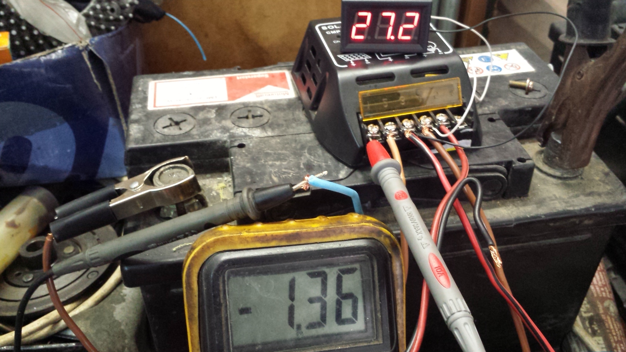 koceto_pz написа:Радвам се че стана добра дискусия в темата,да споделя какво се случва при мен.Вчера си правих проби,на обяд около 13:00 при включен инвертор и консуматори към него поялник 40W енергоспестяваща крушка 14W,телевизор+Булсат около 45-50 W,волтметъра на акумулатора показваше 12.7,в този момент с мултицета премерих директно на панела(входа на регулатора) ,и там показваше 12.8,разликата беше само една десета!Иначе правих проби без никакъв консукатор на акумулатора показваше 13.7 а на панела 17 волта .koceto_pz, наистина ще е чудесно да покажеш по-подробни измервания, но без никакви включени товари.