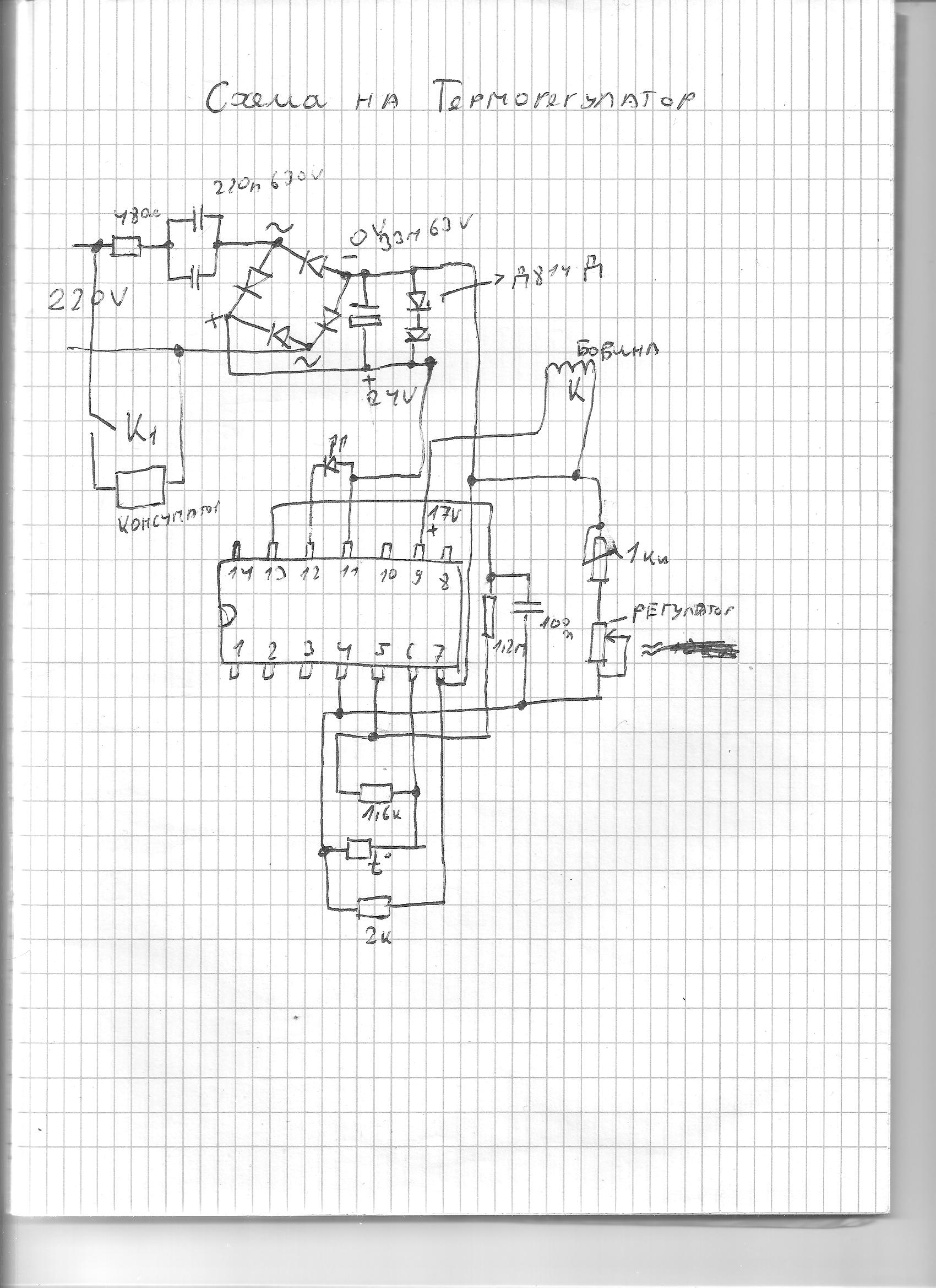 Терморегулатора е с интегрална схема 723P ето тук има терморегулатори с тази интегрална схема : http://kvazer.com/product.php?id_product=22716 а моята схема е тази до колко вярно съм я пречертал не знам,аз използвам за датчик един ценер на 3,3V! моето реле е 10А