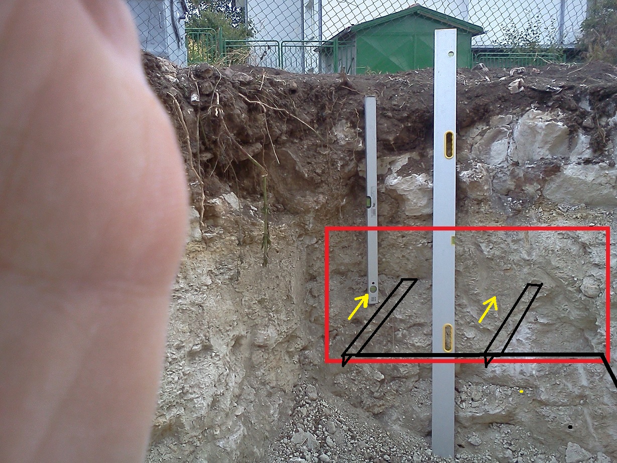 В изкопаната дупка има един слой от бяла глина, на около метър дълбочина. Оградил съм го с червено. Дали е добър проводник? И мога ли да набия по посочената схема хоризонтално коловете, ще бъдат на метър под повърхността.