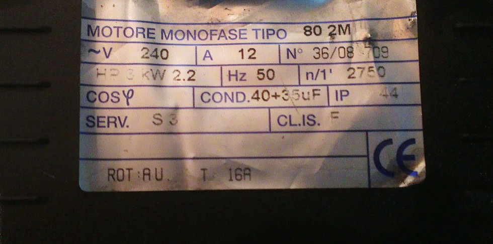 Данните на двигателя са 2,2кW, 2850 оборота - монофазен, на UNIELECTRIC модел 80 2М