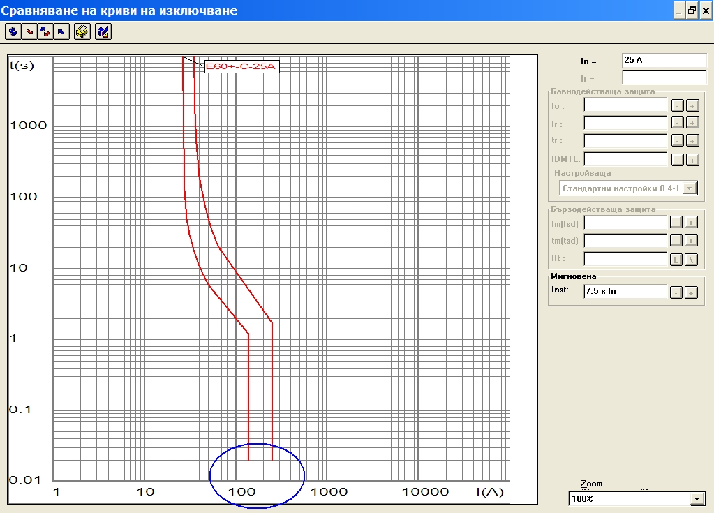 Важно : при избора на кривата на изключване да се има в предвид дъжината на защитаваната линия и да се провери импеданса фаза-нула и фаза-защитен проводник и да се провери дали предпазителя с избраната крива ще изключи за необходимото време 0,4 сек. при 230 в. и 0,2 сек. при 400 в.